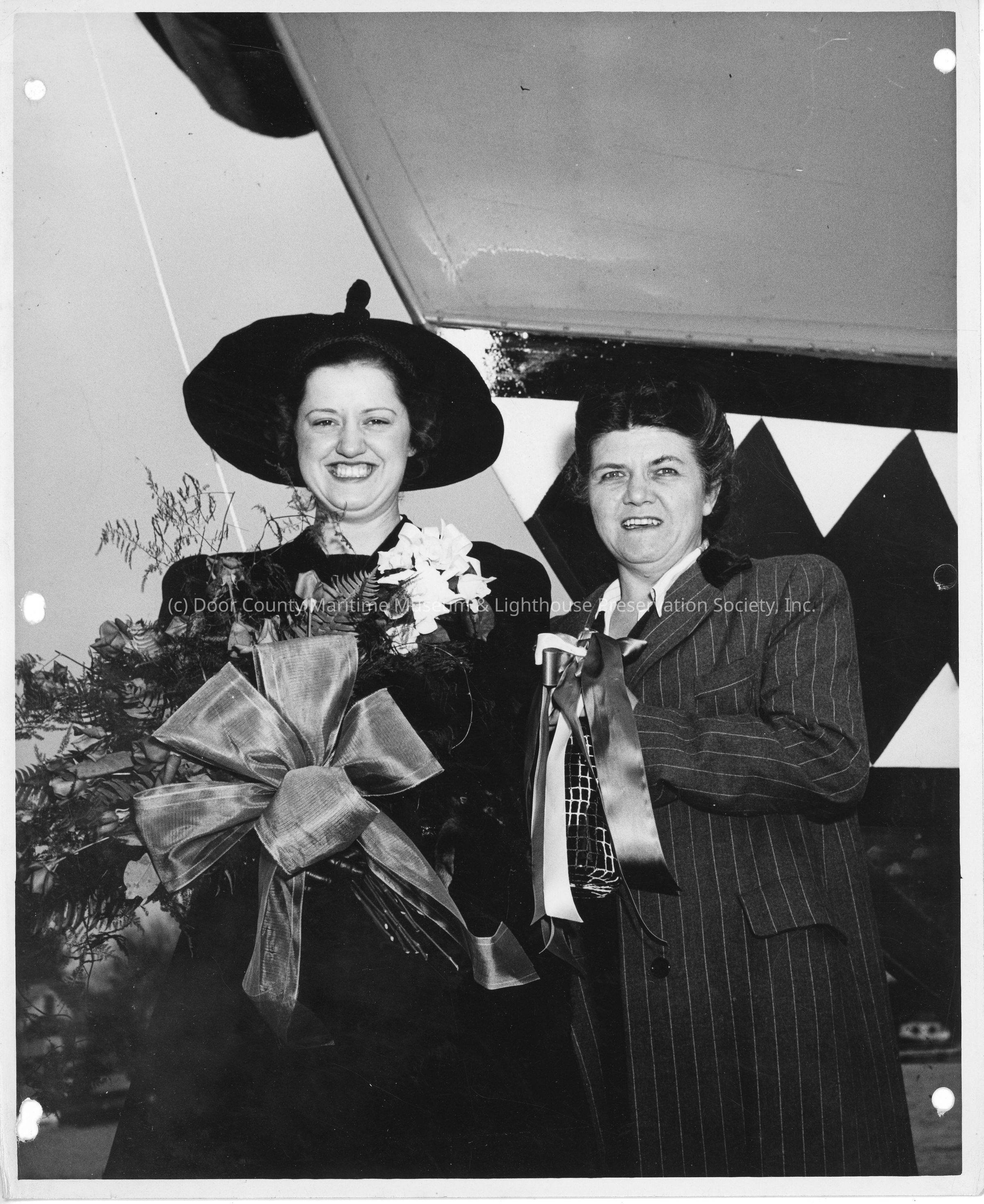 P-569 sponsor Mrs. Nick Propesur holding flower with woman holding christening bottle in front of P-569 May 20, 1944Entry/Object ID