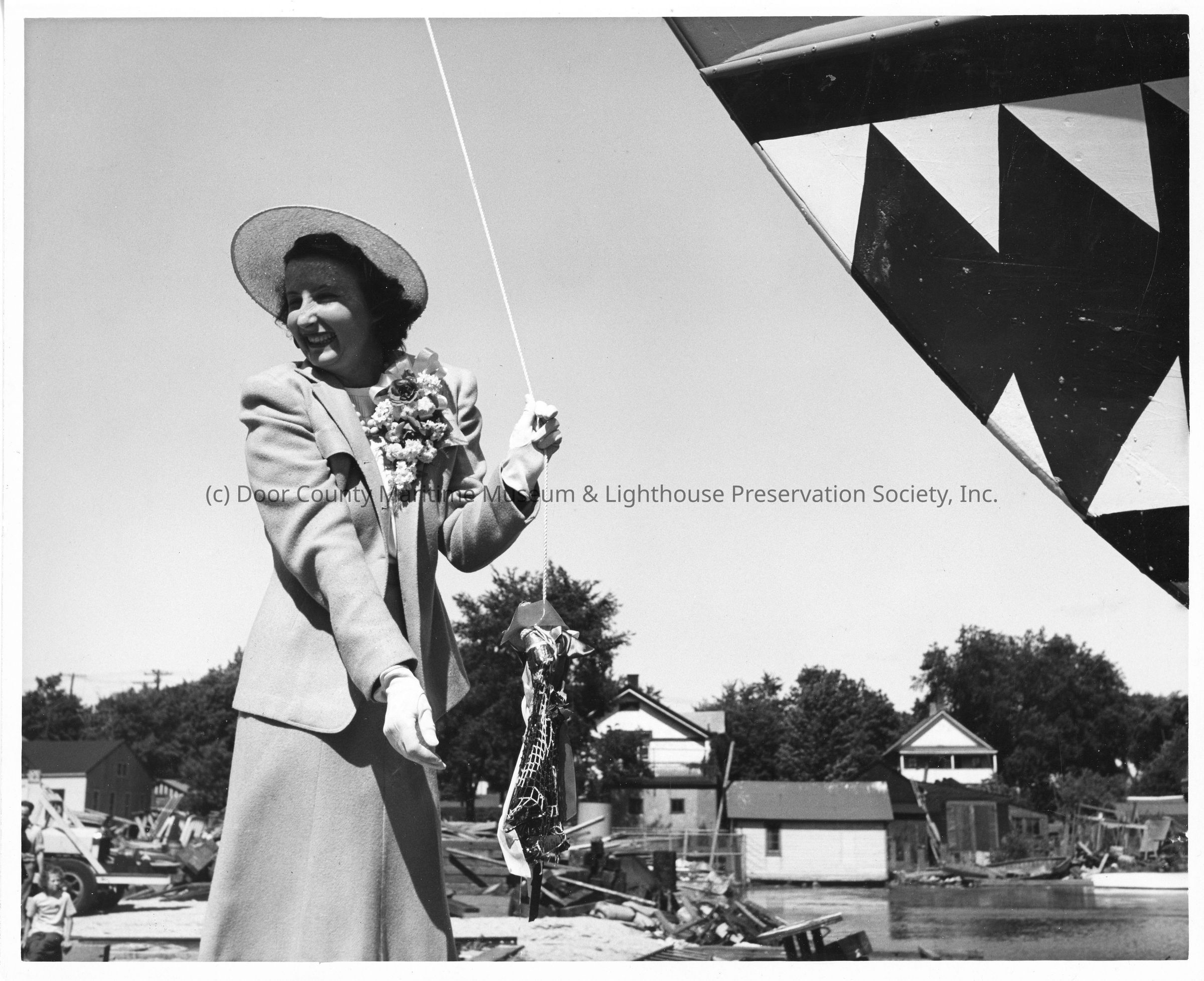 P-571 ship sponsor holding christening bottle post-christening at Peterson Boat Works July 15, 1944Entry/Object ID