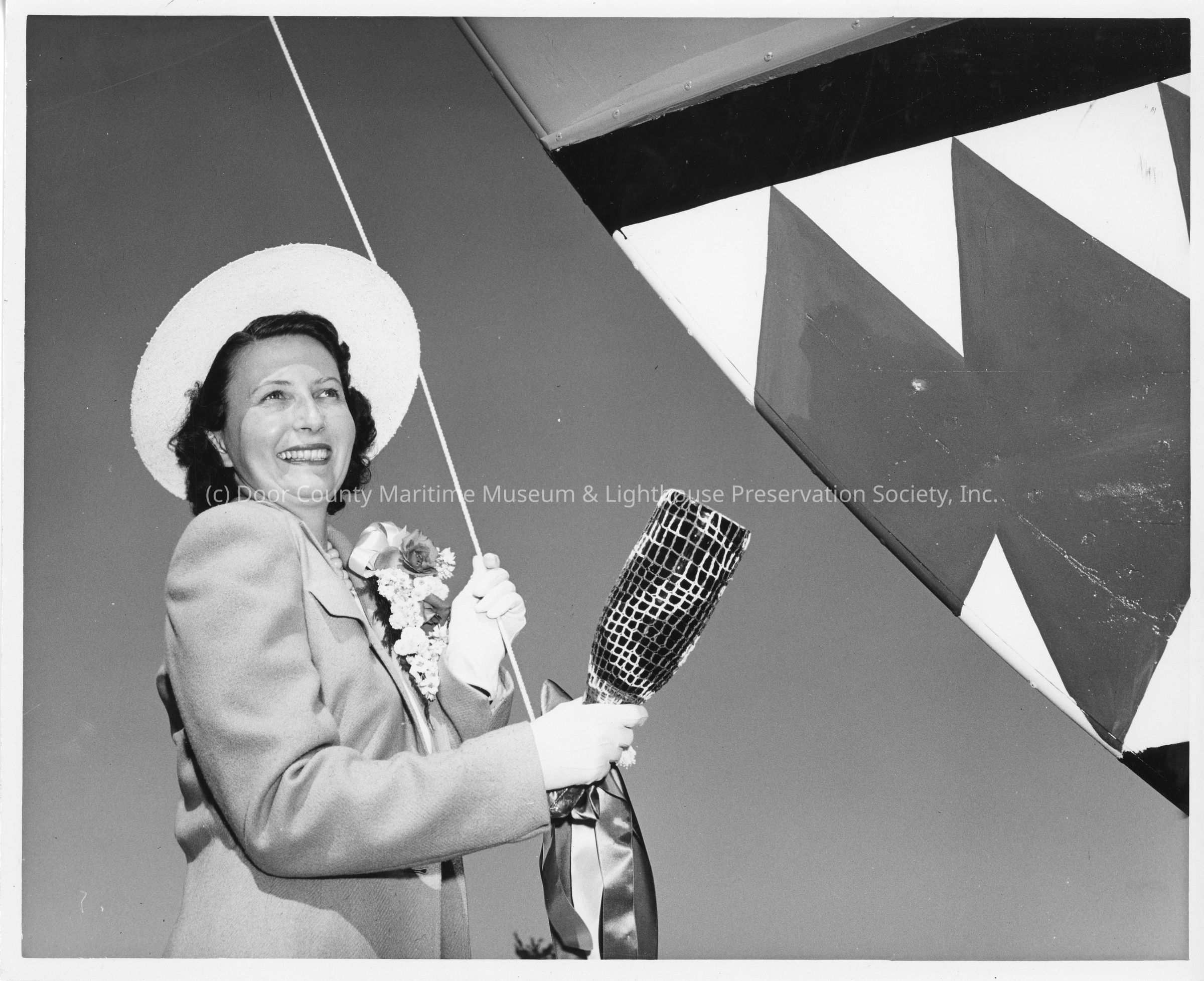 P-571 ship sponsor holding christening bottle pre-christening at Peterson Boat Works July 15, 1944Entry/Object ID