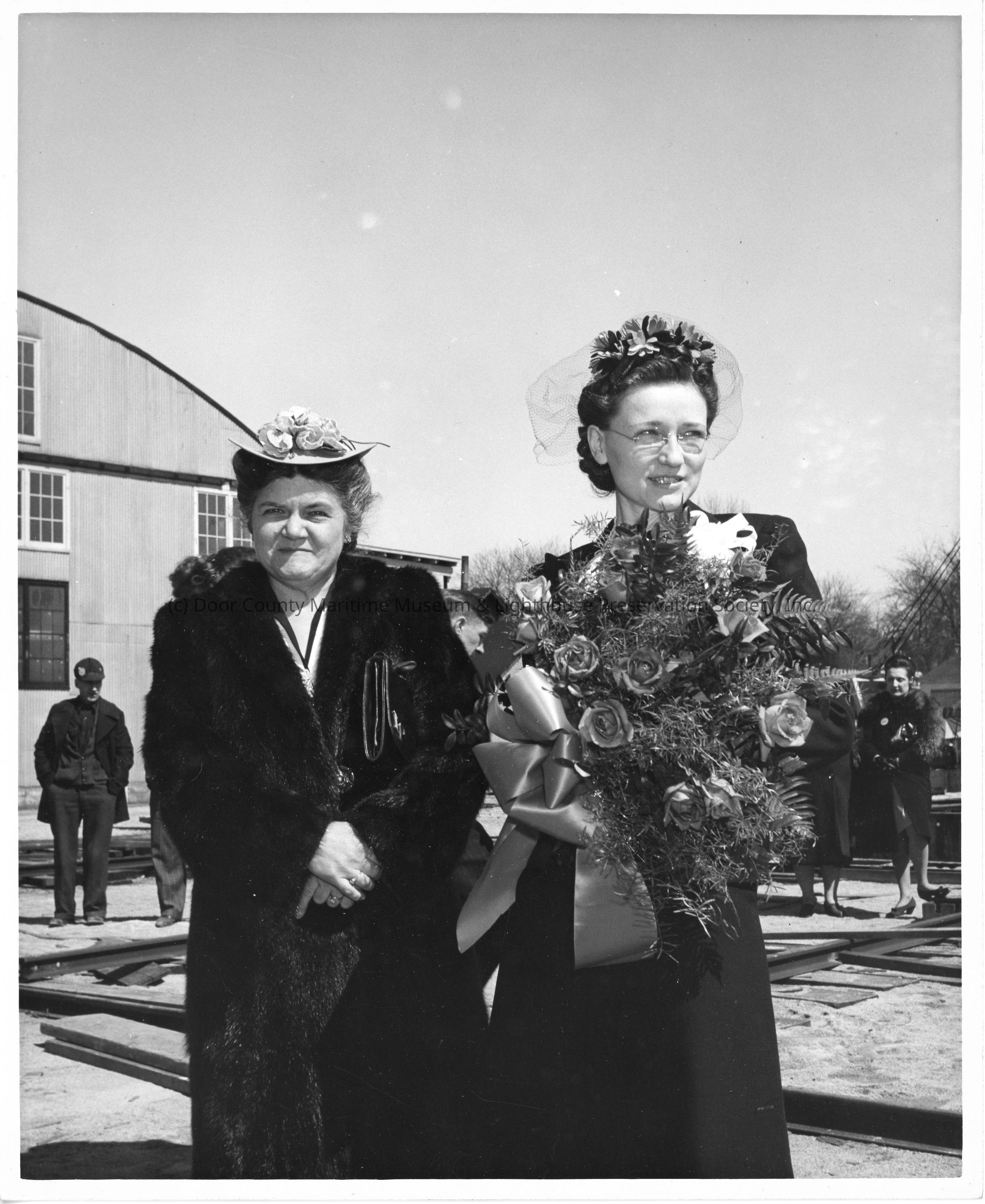 Pair of SC-1517 ship sponsors holding flowers at ship christening at Peterson Boat WorksEntry/Object ID