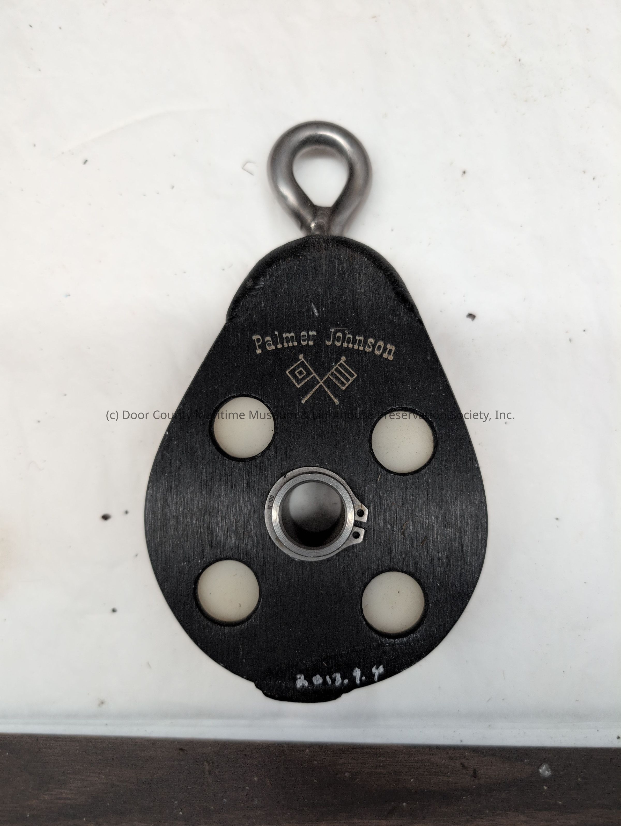 Black metal Palmer Johnson Logo 4 holes on both sides Hole in center on both sides Silver metal hook on top White plastic disc in between