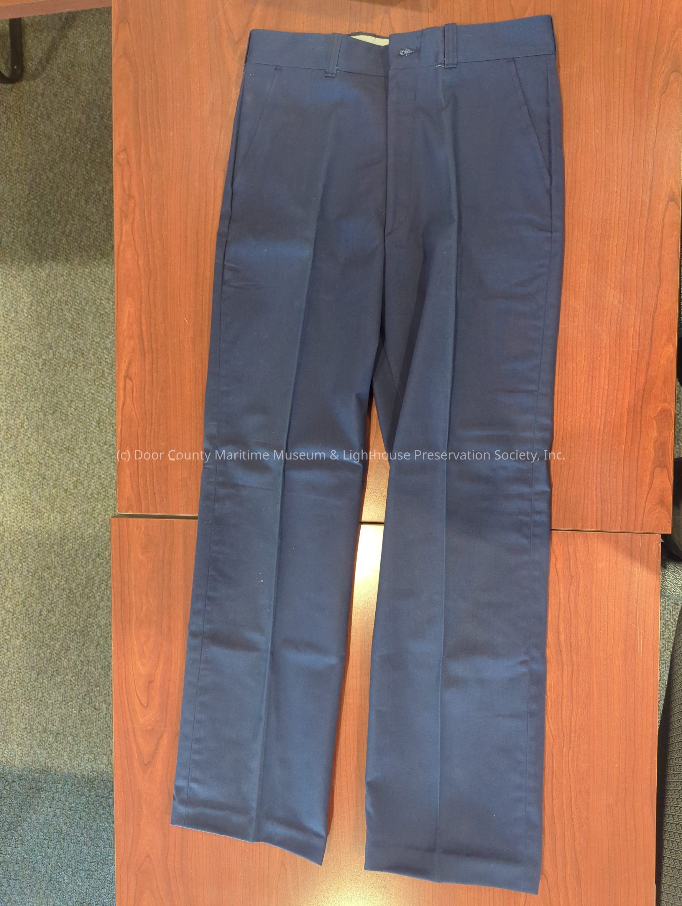 Navy blue pants; front zipper; white/brown button closure above zipper; 2 back pockets; left one has white/brown button; 6 belt loops.Location