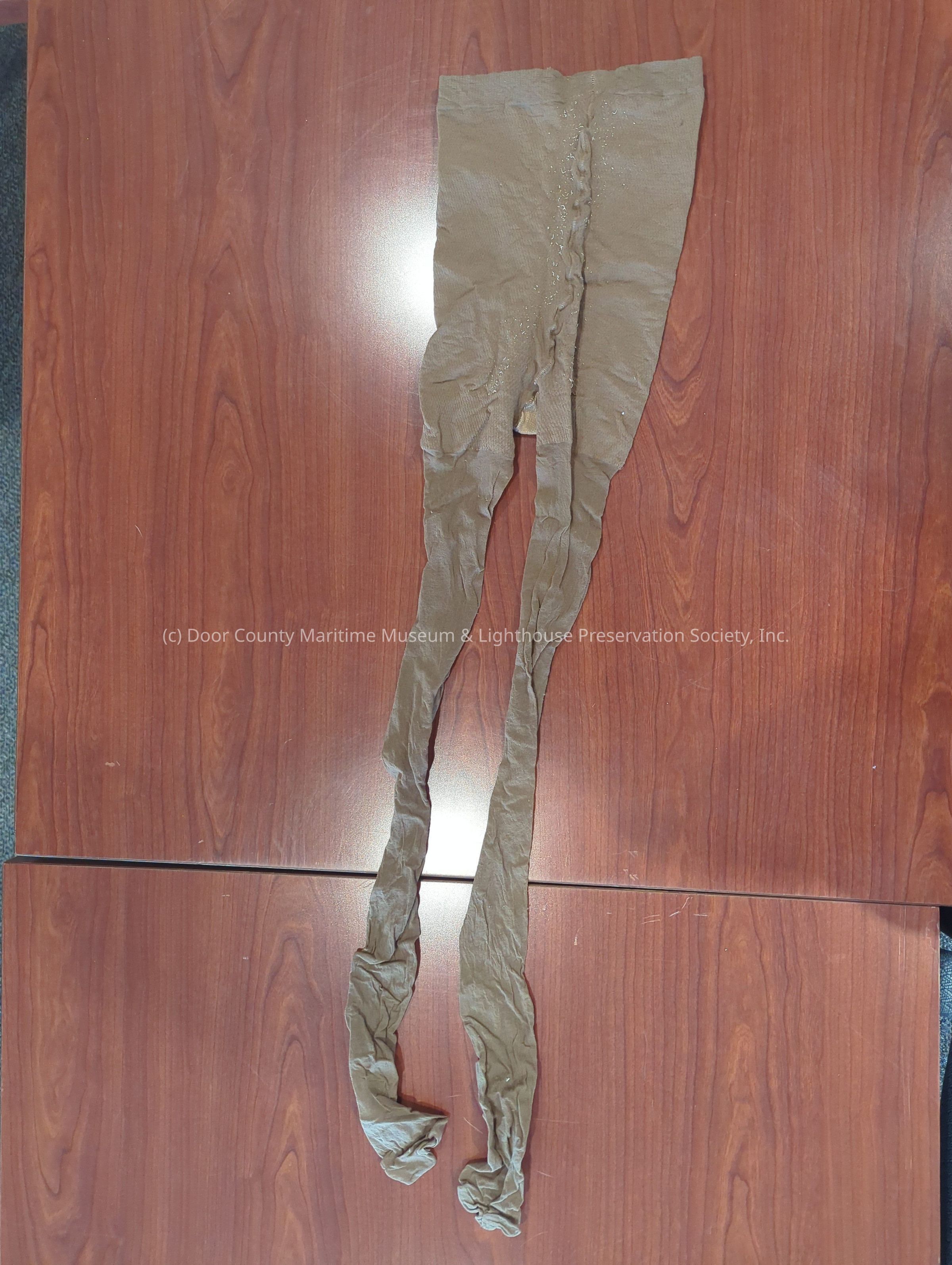 Pantyhose: tan; elastic band at top of panty; all stretch fabric.
