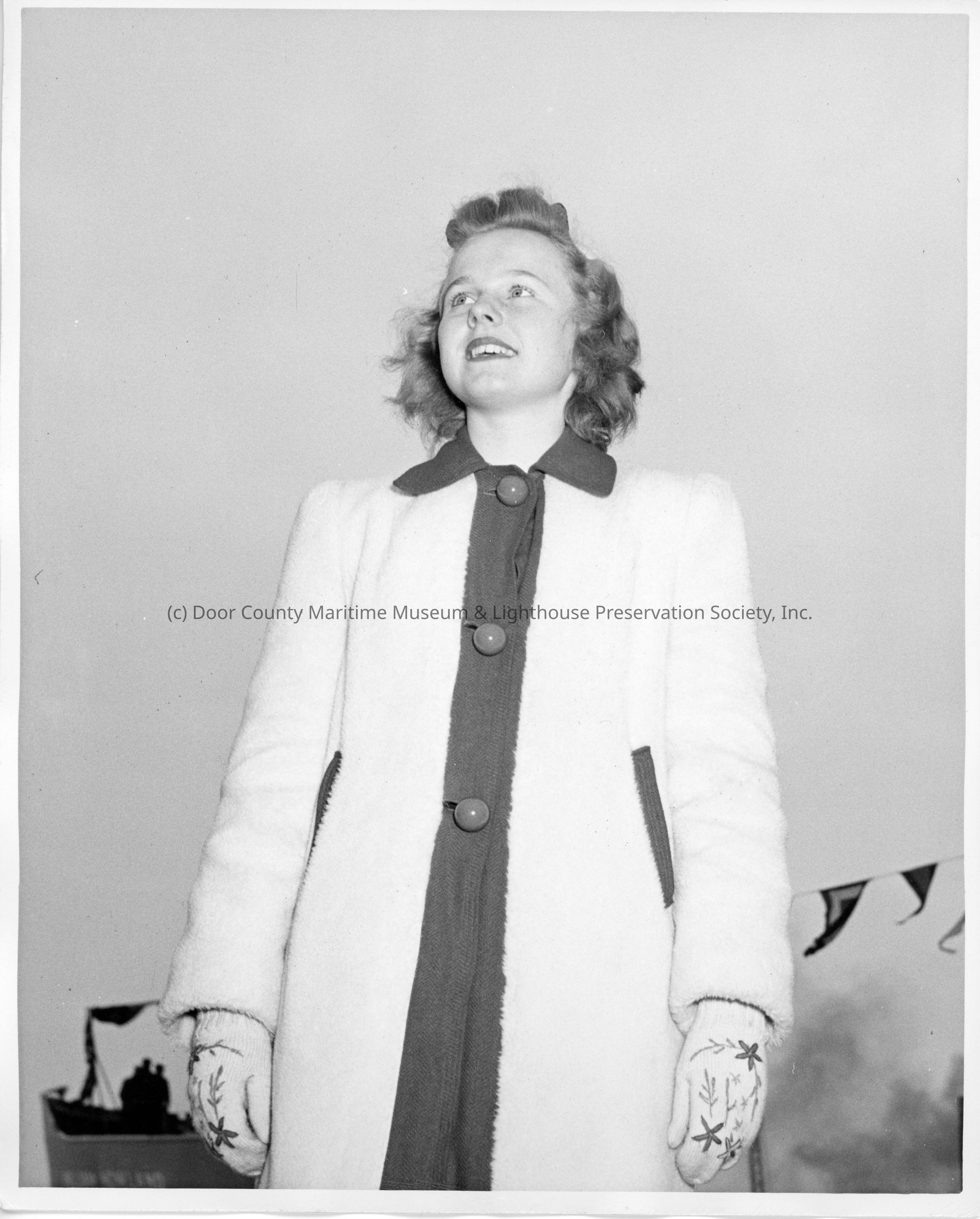 Patsy Smith wearing white coat with floral decorated glovesEntry/Object ID