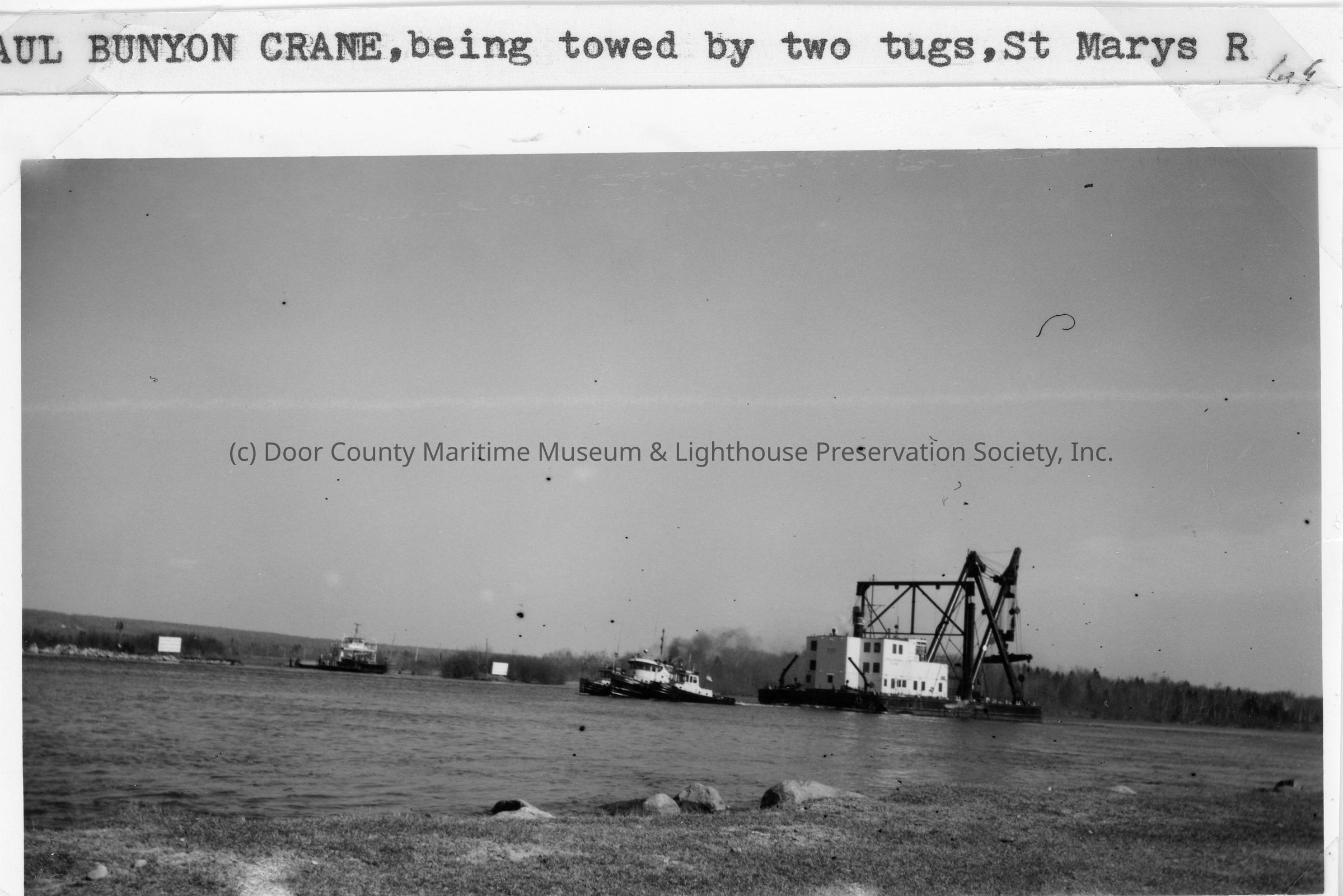 Paul Bunyon crane being towed by two tugs on Saint Marys River 1969