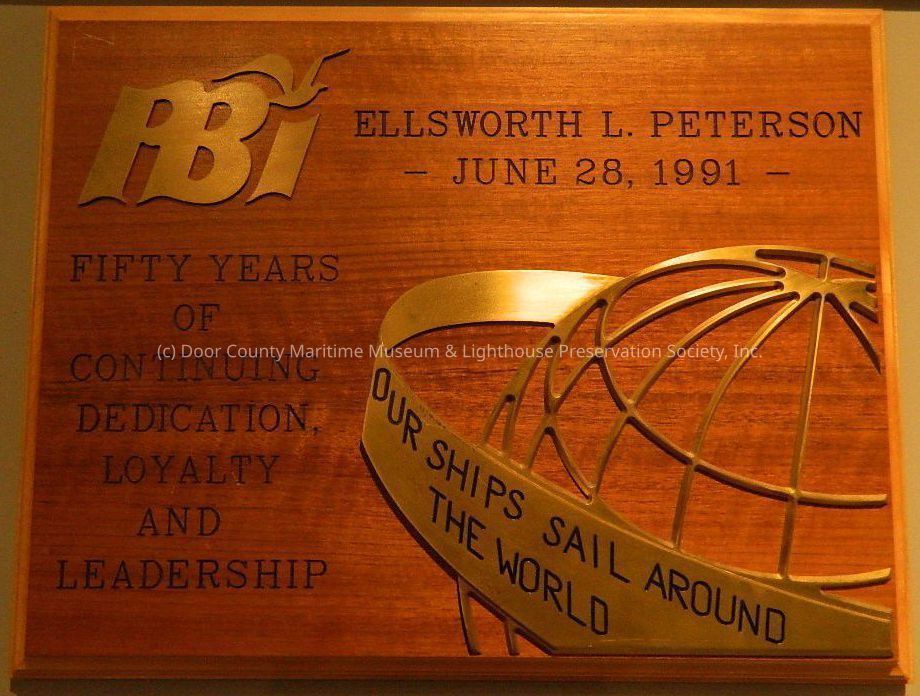 Varnished wood plaque; gold metal PBI logo and globe with "Our Ships Sail Around the World" ; in black "Ellsworth L. Peterson, Fifty Years of Continuing Dedication, Loyalty and Leadership; June 28, 1991."