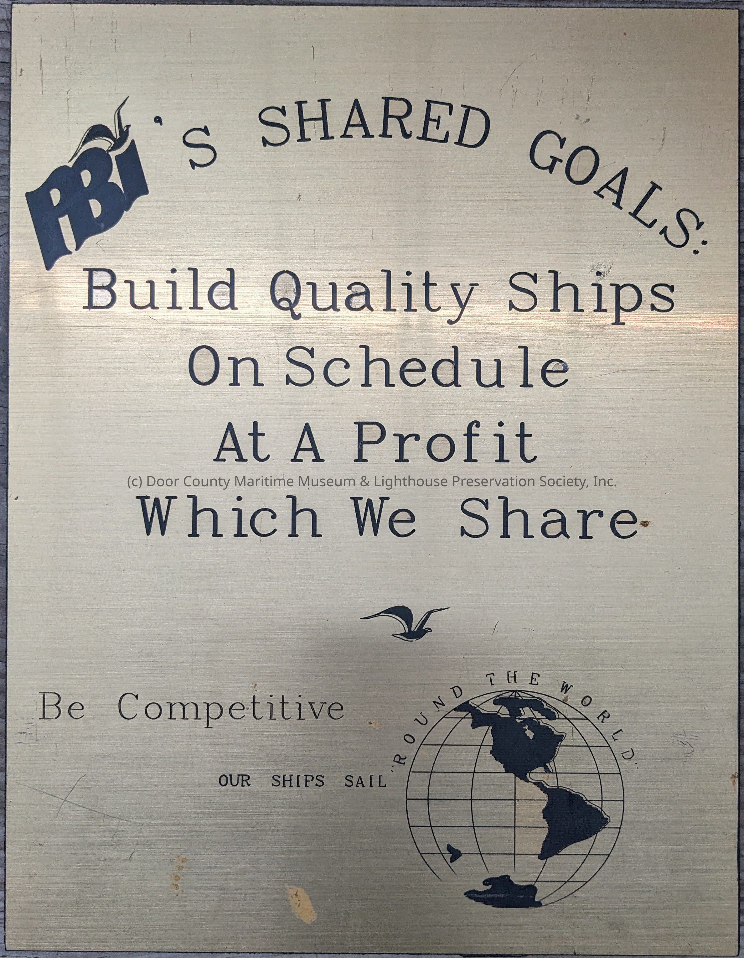 Brass colored metal with black lettering. Picture of globe and PBI logo