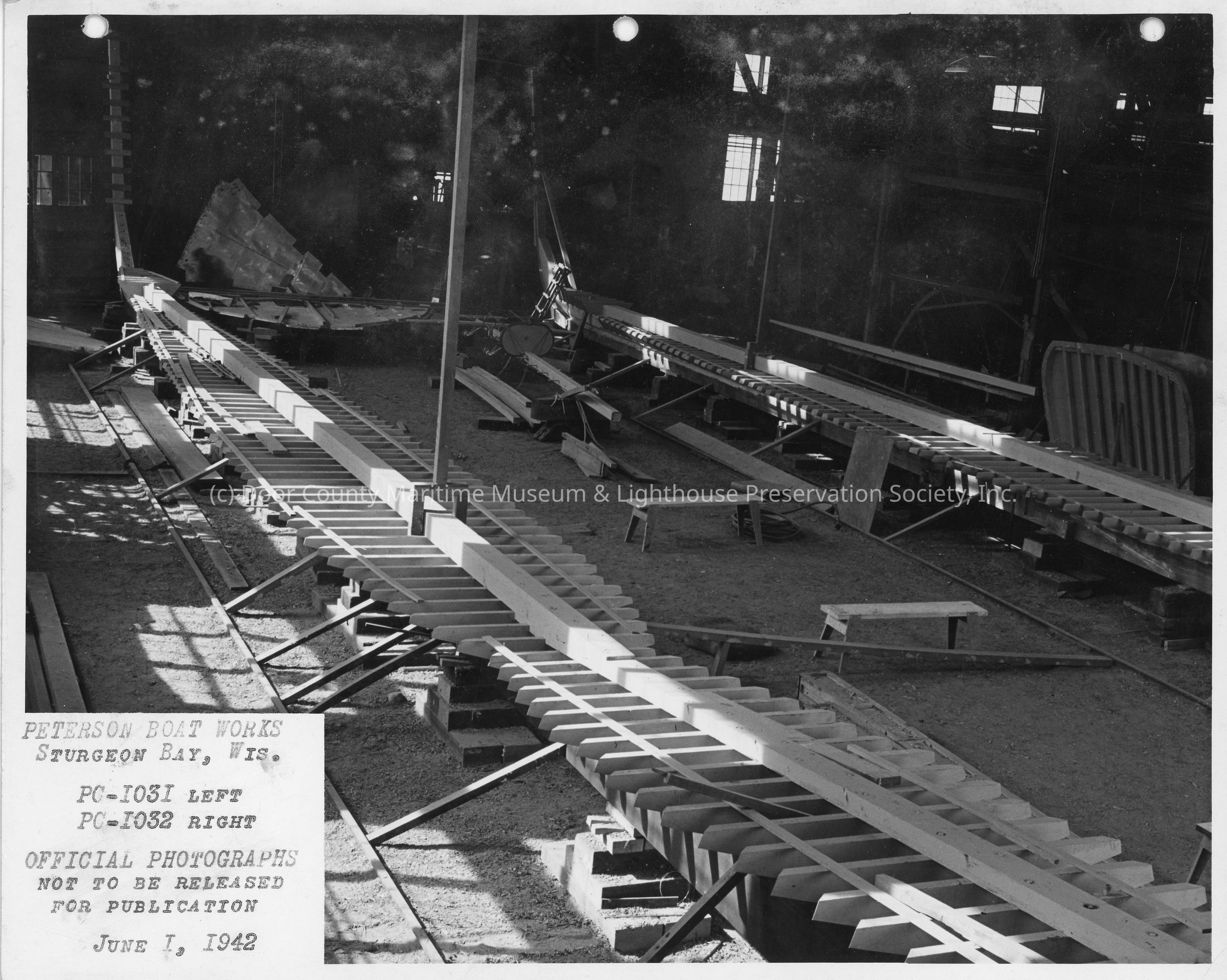 PC-1031 and PC-1032 frames under construction at Peterson Boat Works June 1, 1942