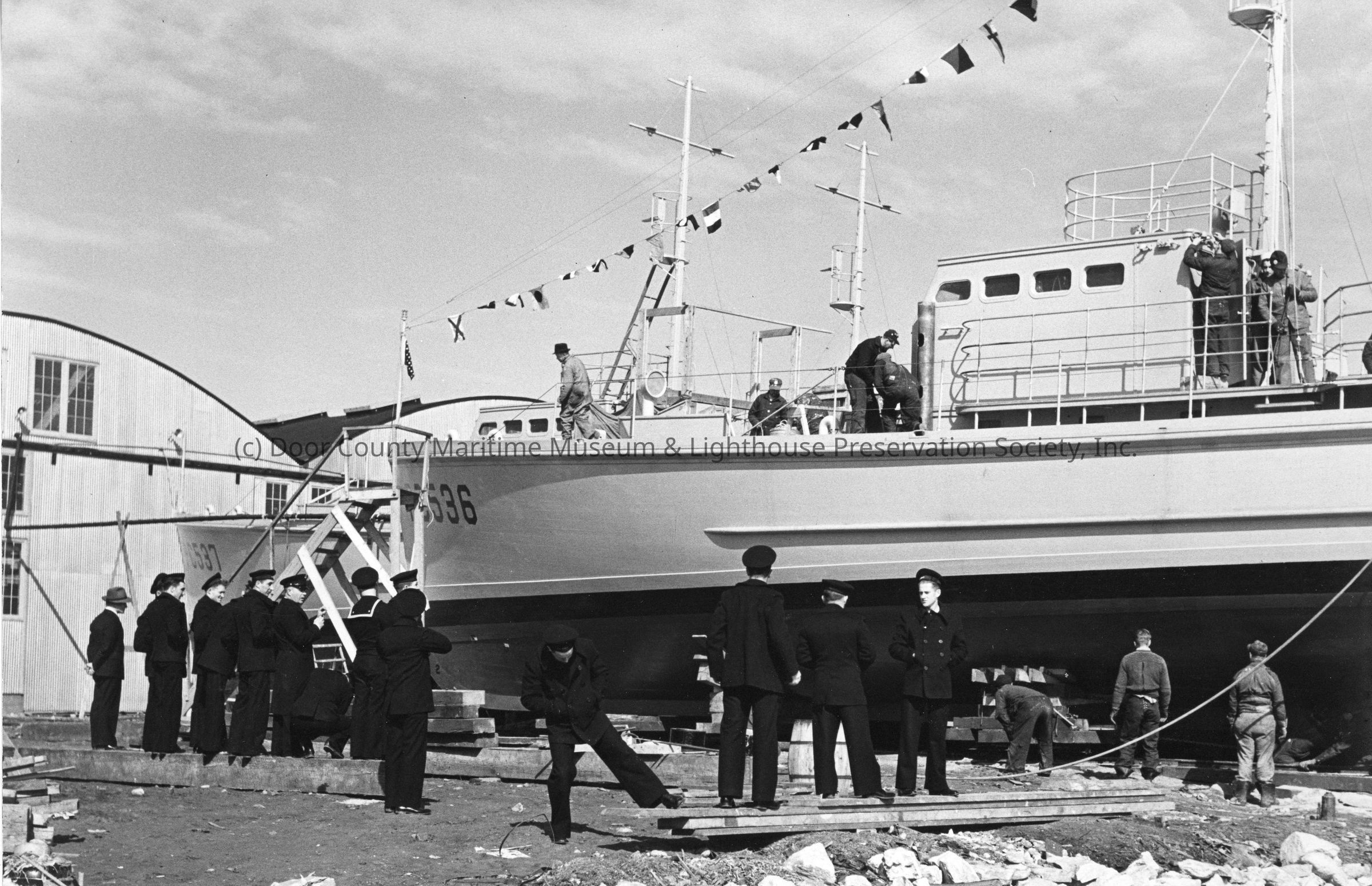 PC-536 and PC-537 on skids at Peterson Boat Works with sailors and workers on ground and aboard PC-536Entry/Object ID