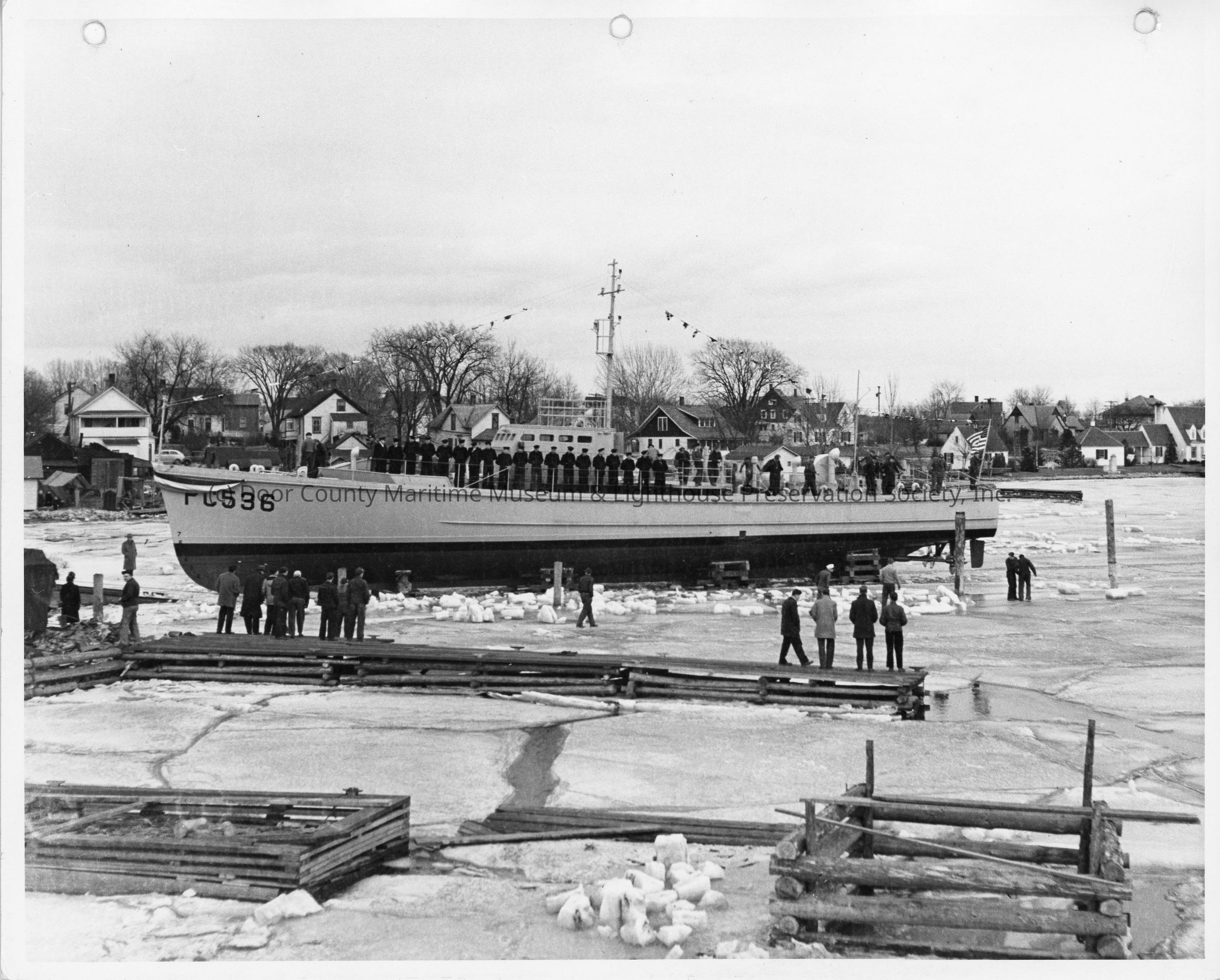 PC-536 on skids with men aboard at Peterson Boat Works March 5, 1942