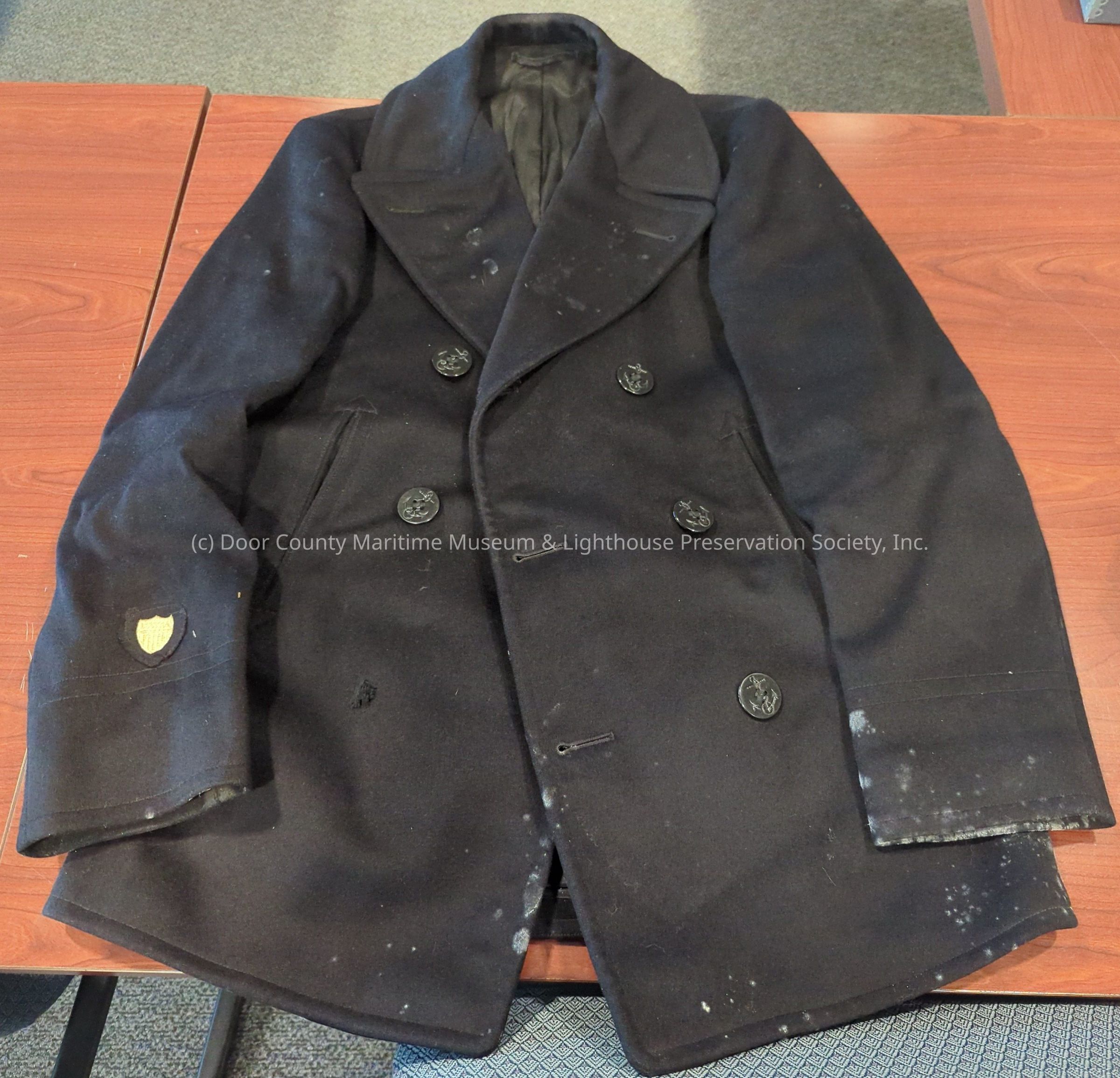 Jacket, pea: overall color navy blue; traditional pea coat cut; 3 buttons; with large lapel flaps; shield emblem on right sleeve.Location
