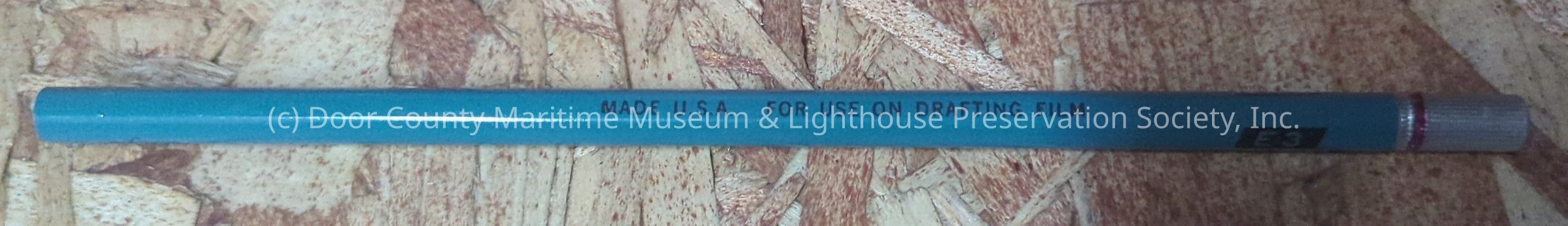 Turquoise Pencil with silver metal on one end. Black text on the side of object