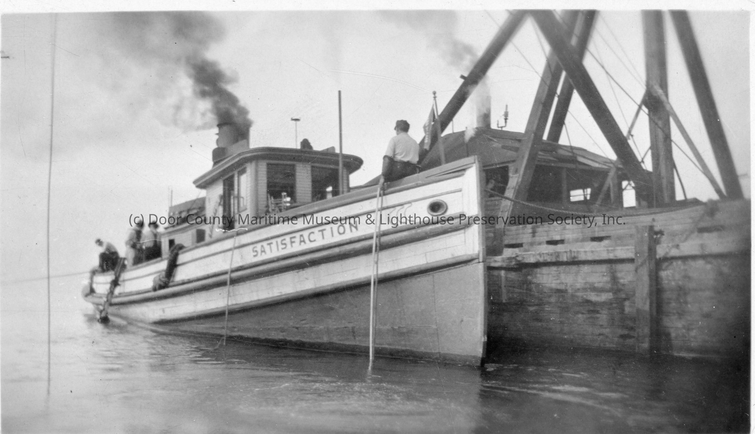 People on deck of Satisfaction docked next to barge