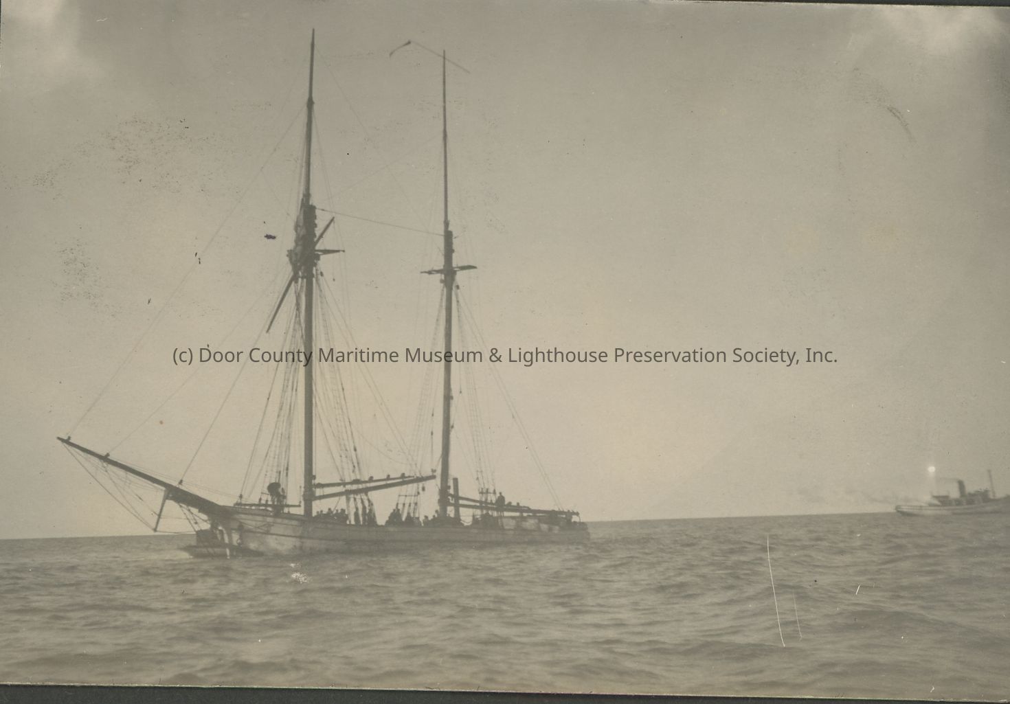 Unidentified people on unidentified schooner, no sails. Tugboat underway in background.