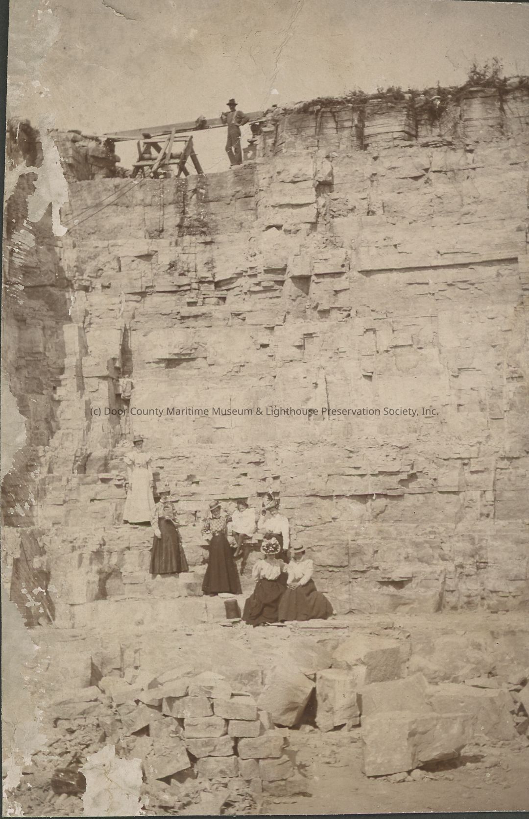 Six well-dressed women wearing hats, and one child, pose on the face of the quarry.