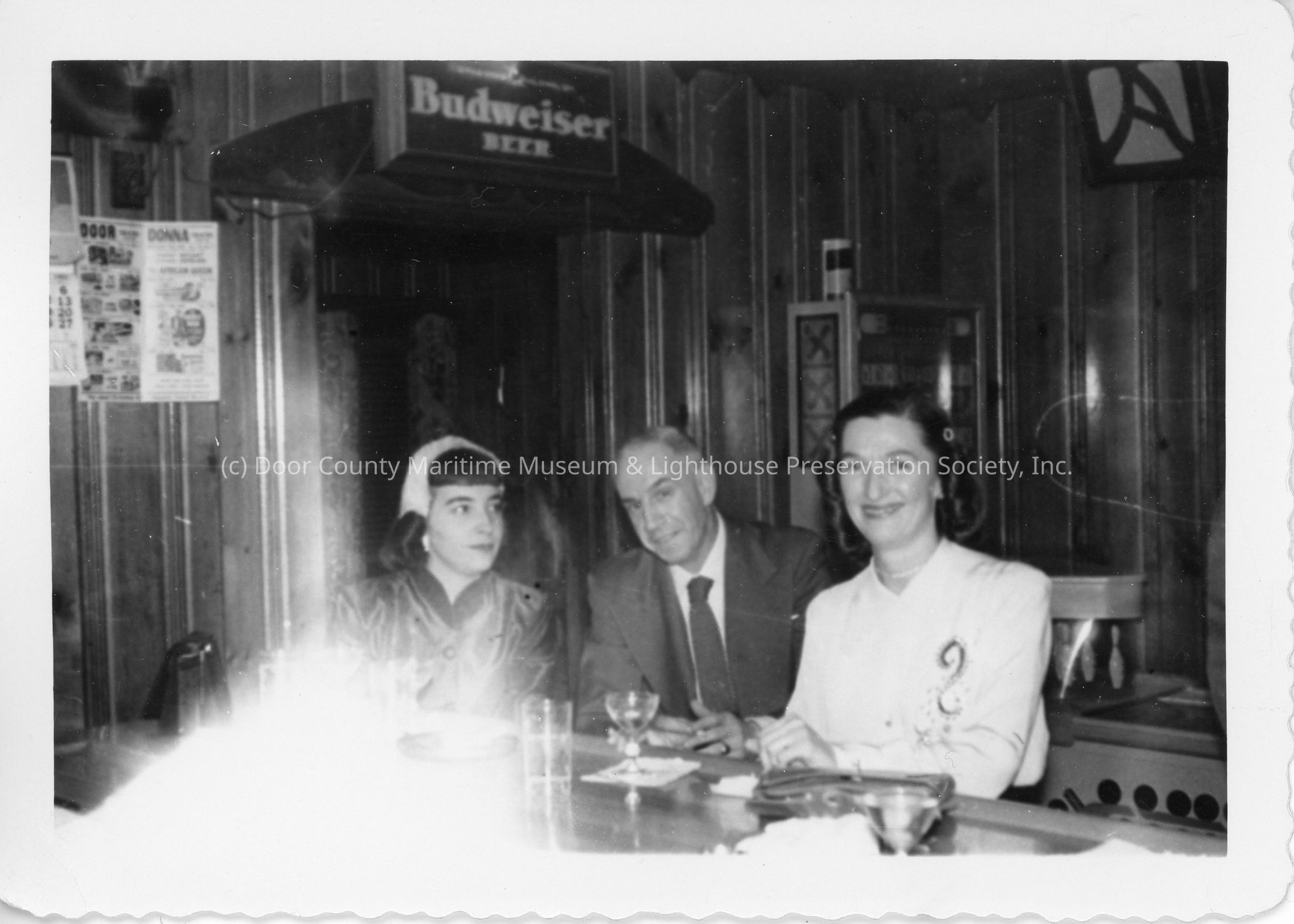 Colorless photograph of Navy Office Party. Mary Jane Choudoir, Ray Schmitz, and Gertrude Schmitz at the bar.Location