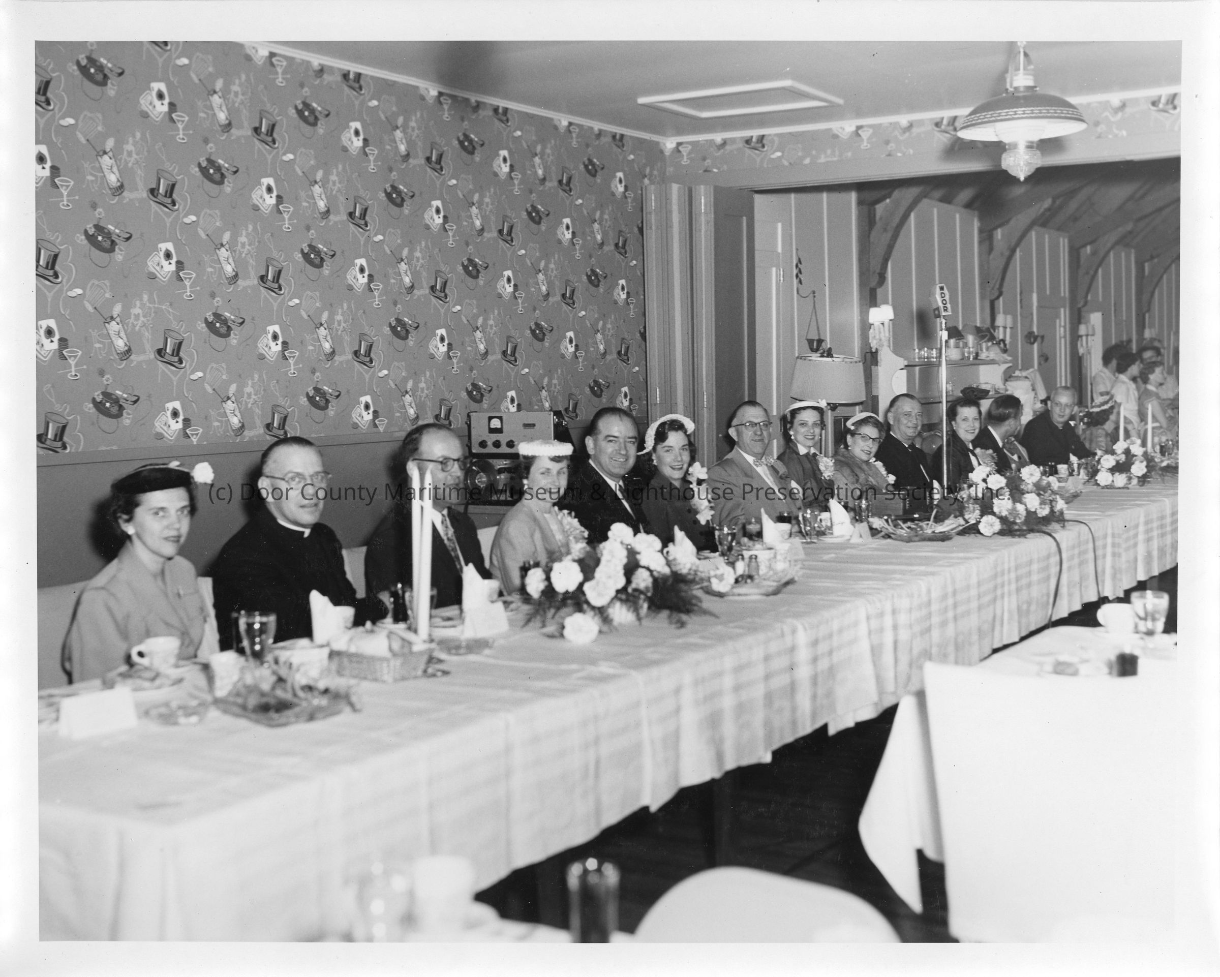 People sitting at table during launch party of LST-1170, May 22, 1954