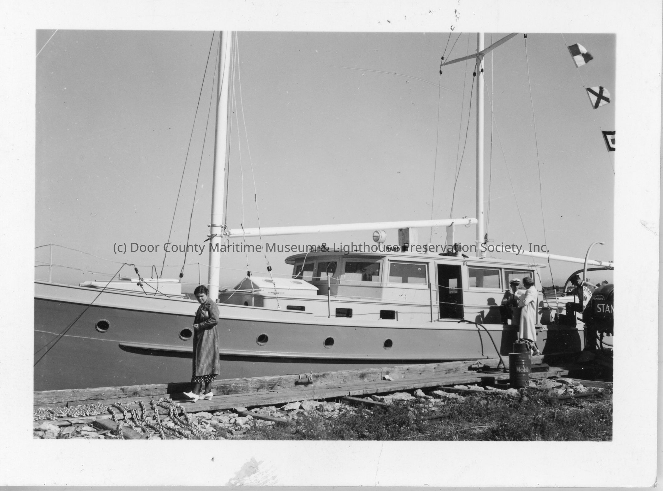 People standing next to docked sailboat Mako 1937