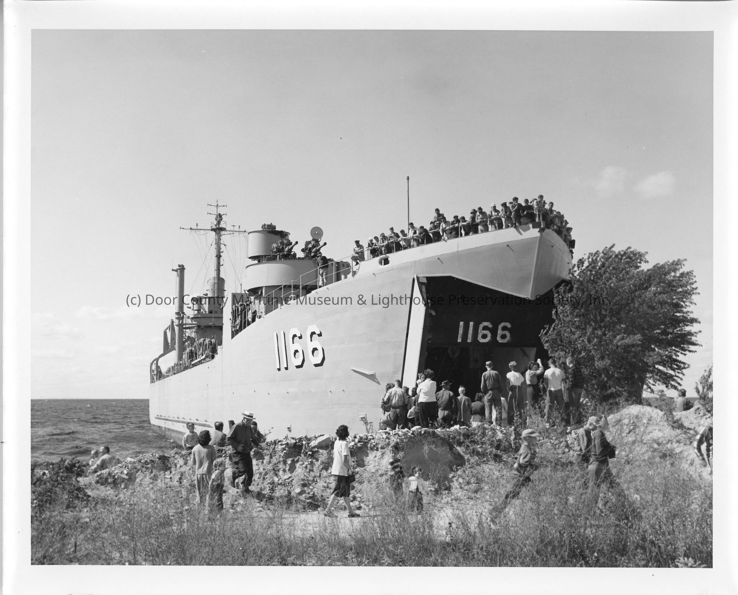 People standing on shore in front of LST-1166, September 4, 1953