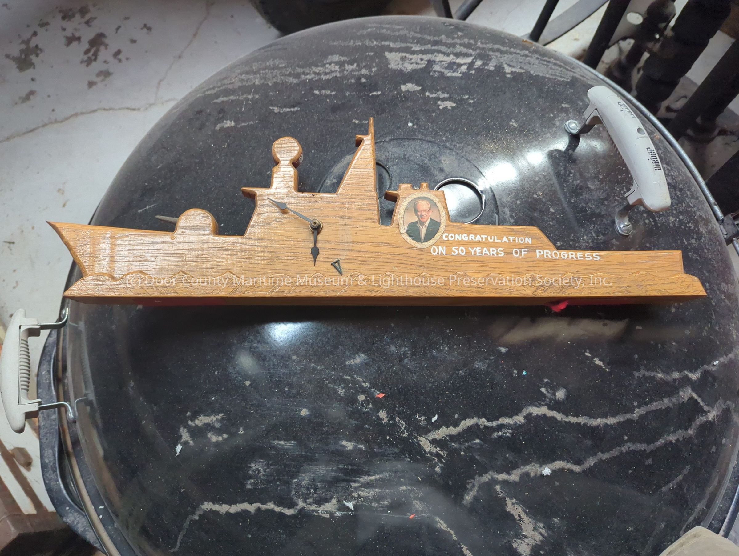 Wood plaque with text "50 years of progress". Has loose clock hands. In the shape of a sailing boat. Picture of Fred Peterson
