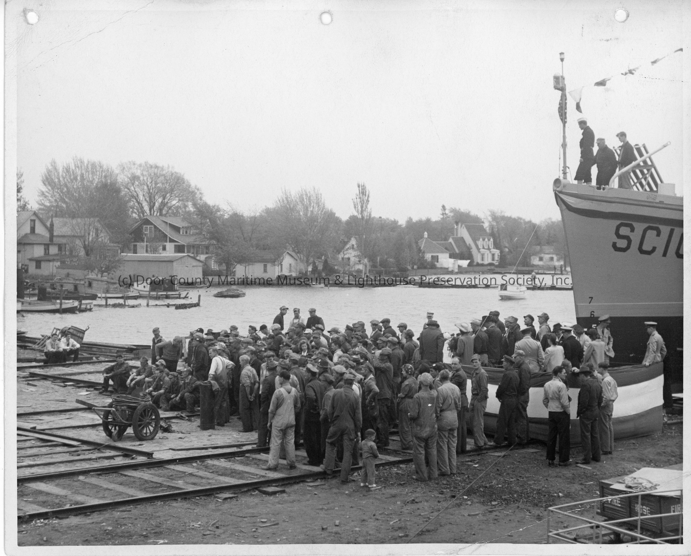 Peterson Boat Works employees gathered in front of SC-1037 pre-christening May 29, 1943Entry/Object ID
