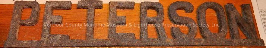Iron nameplate ''PETERSON" ; corroded, rusty.