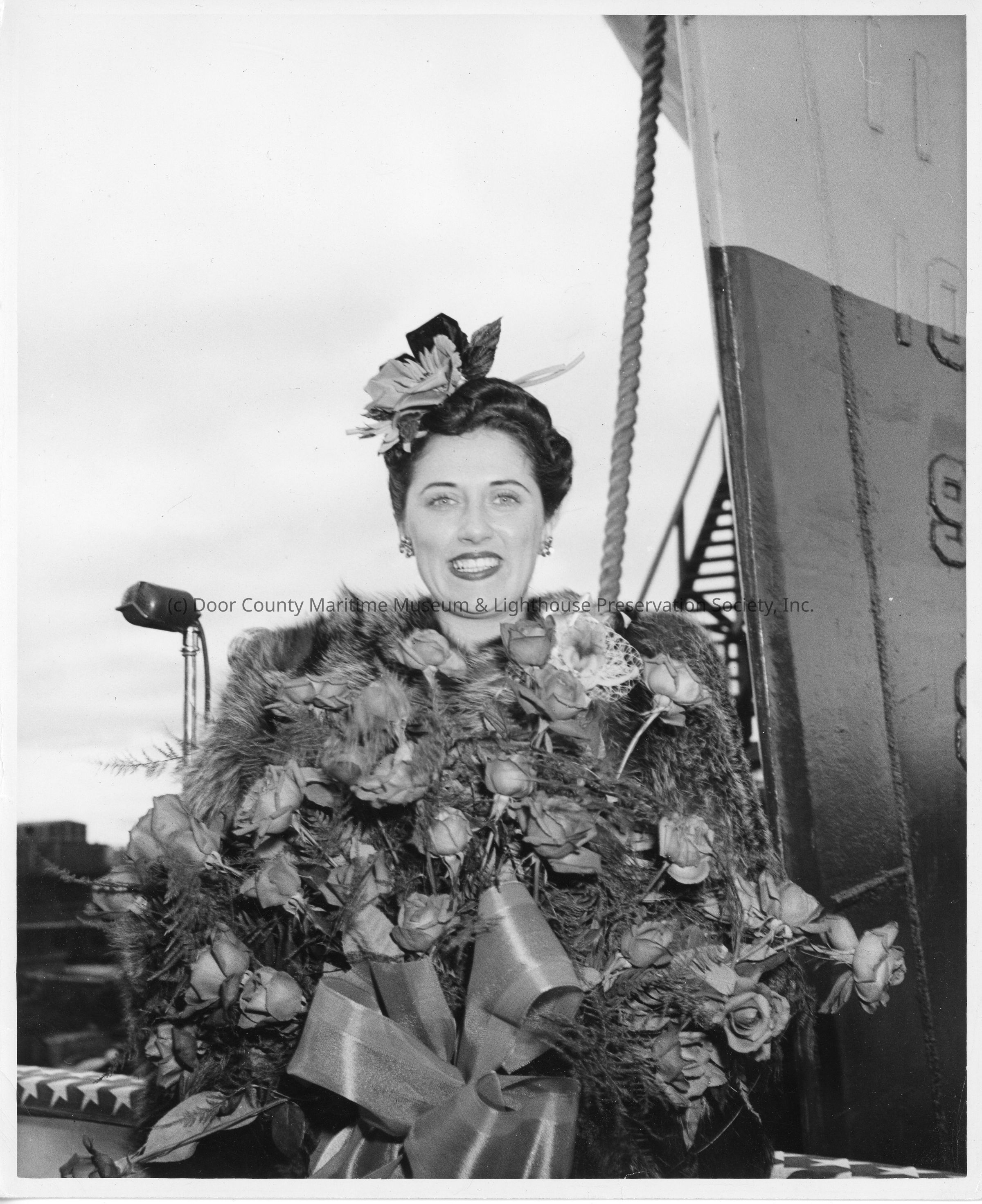 PF-70 ship sponsor Mrs. Davis with flowers at christening