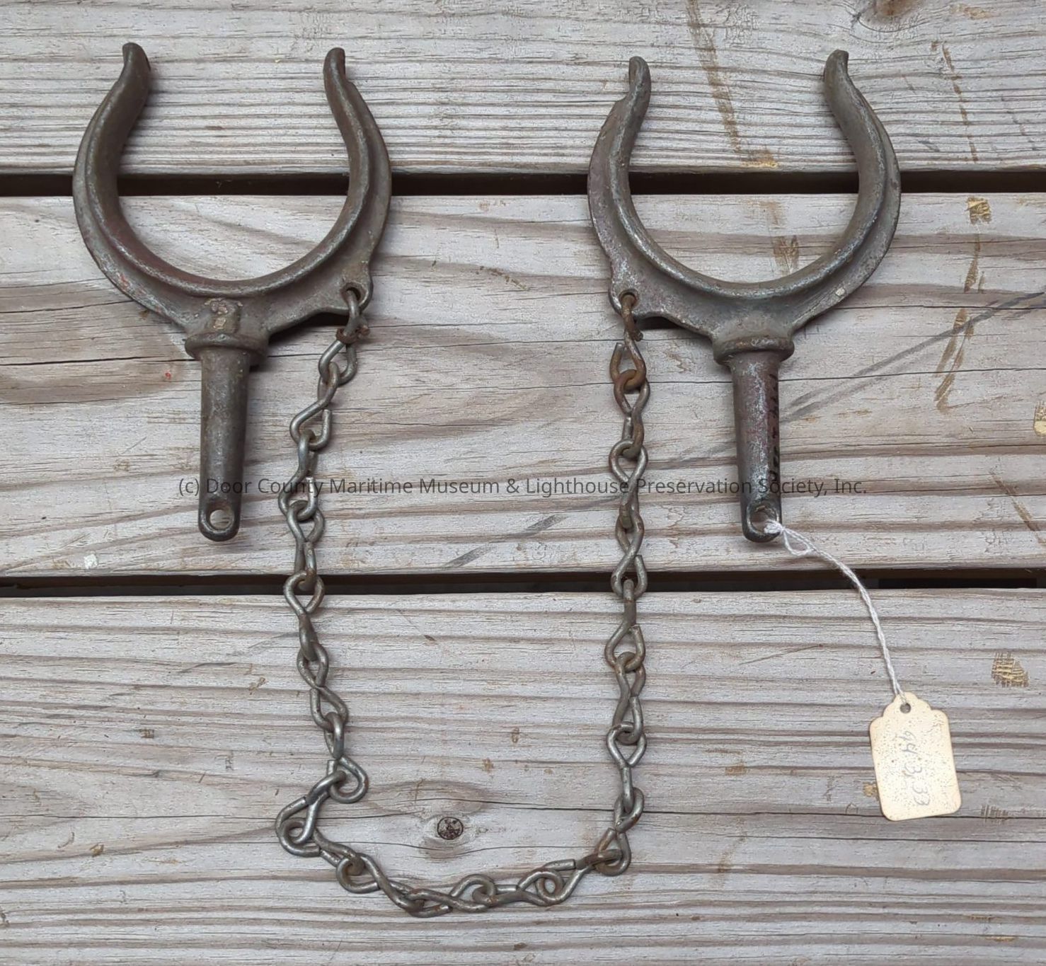 Pair of metal oarlocks connected by a chain.