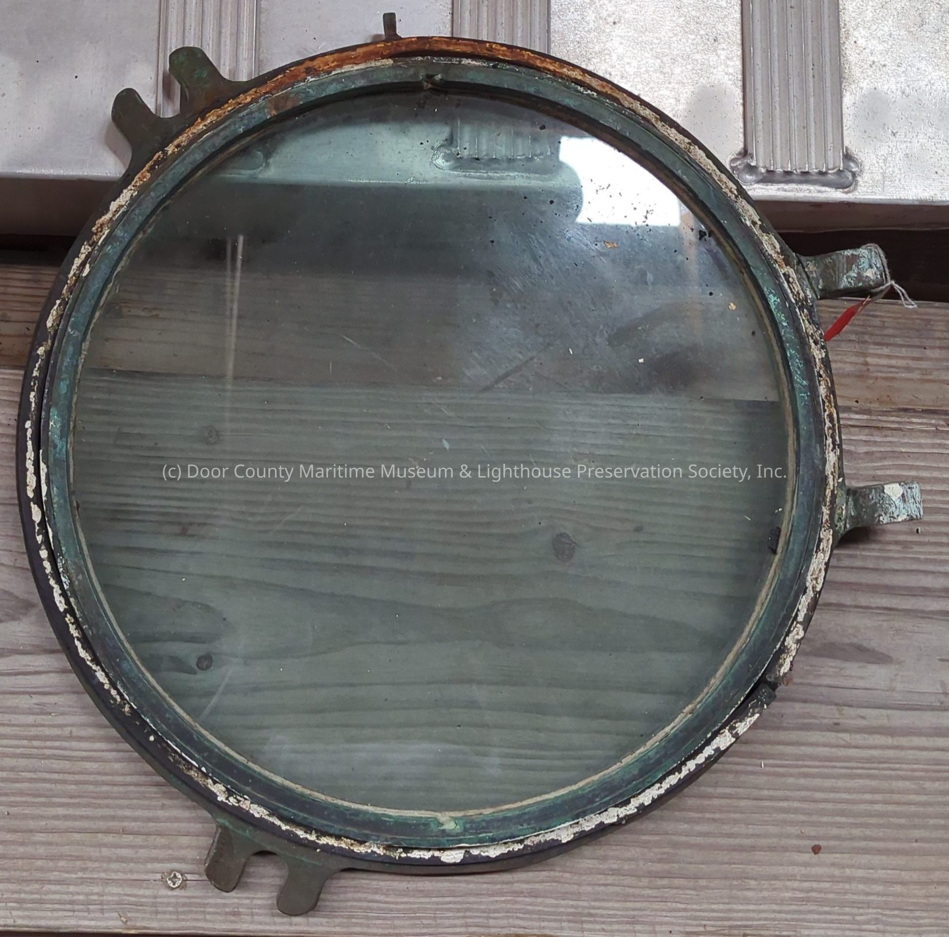 Areas of white caulk or paint show on brass frame. Green tint in glass