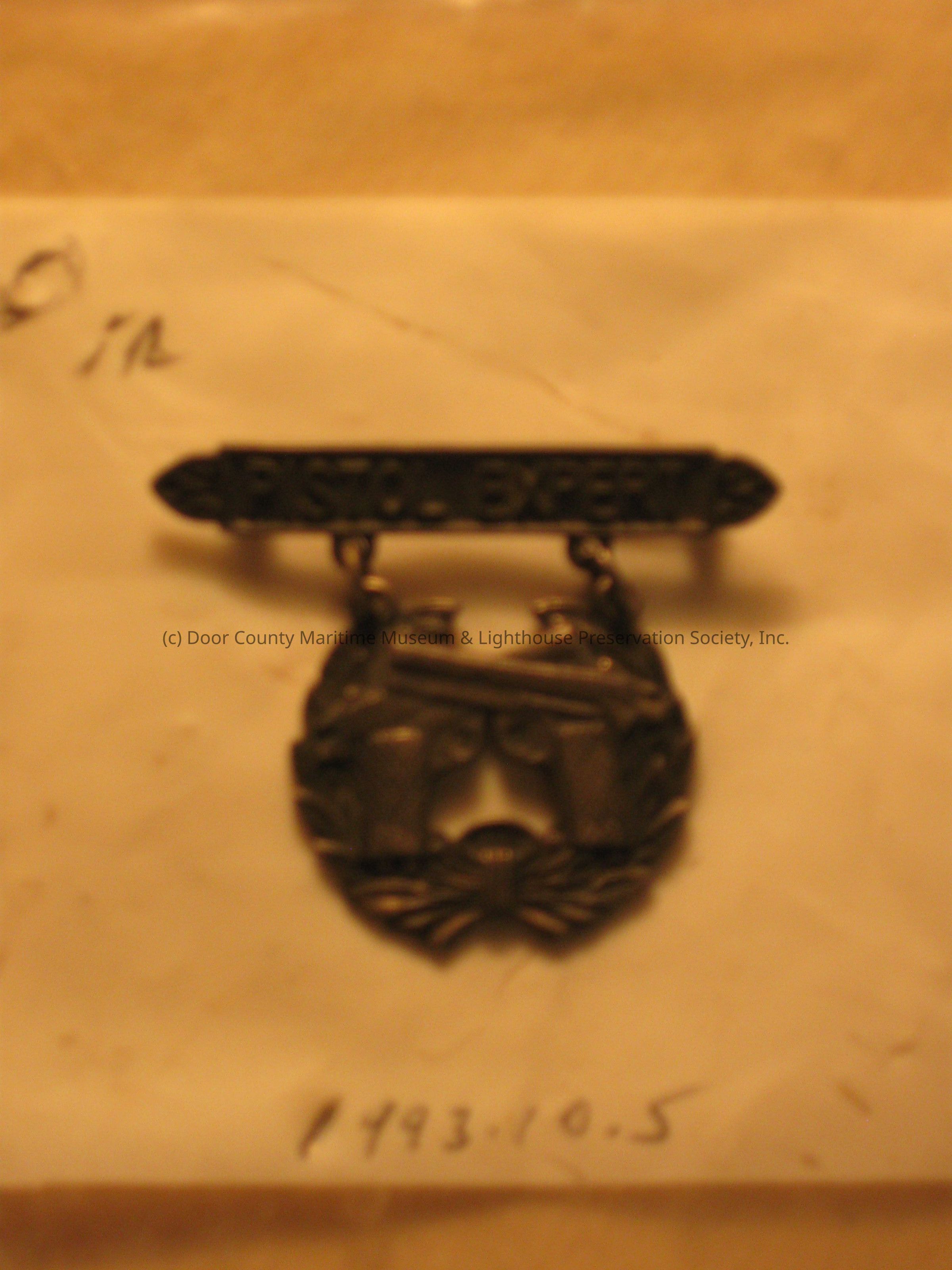Overall color / Black with raised polished areas Top bar reads “PISTOL EXPERT” with a wreath featuring two crossed handguns hanging by two small rings. Sterling silver.