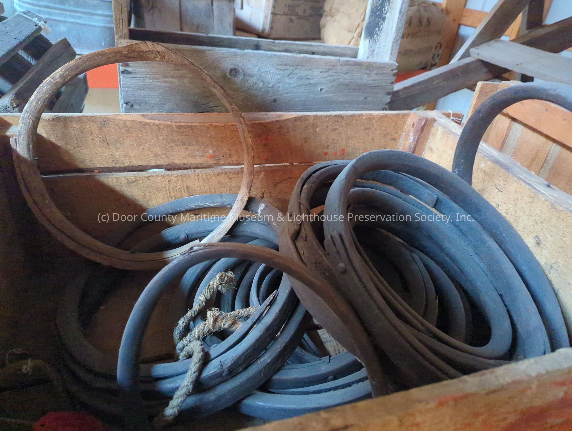 Dark brown collection of 18 pond net hoops. Metal rivets hold wood wrap together forming hoop.