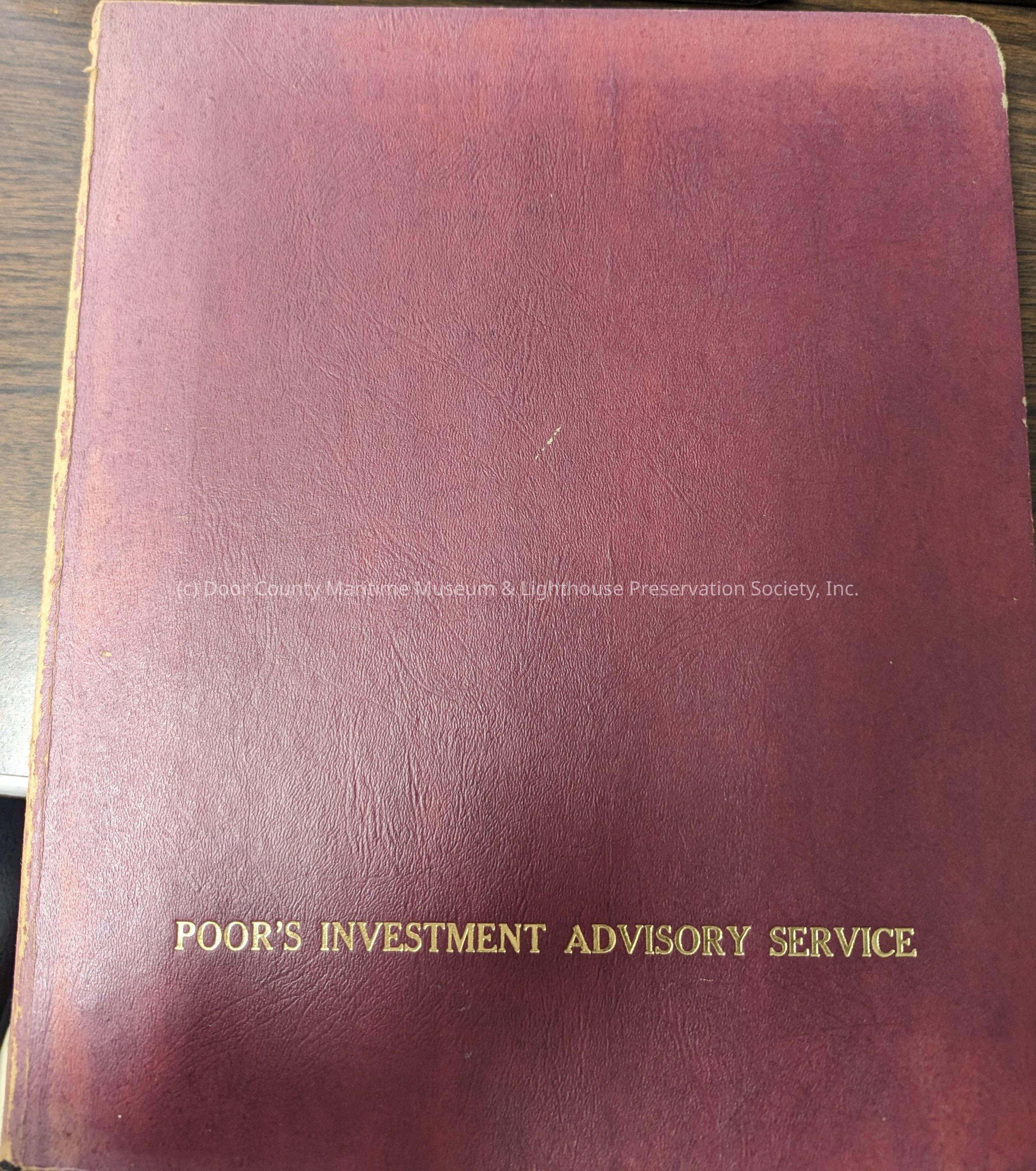 Maroon Hard Cover three ring binder with gold print. "Poor's Investment Advisory Service". Contains log of barge Marquis Roen from 1966-1967Location