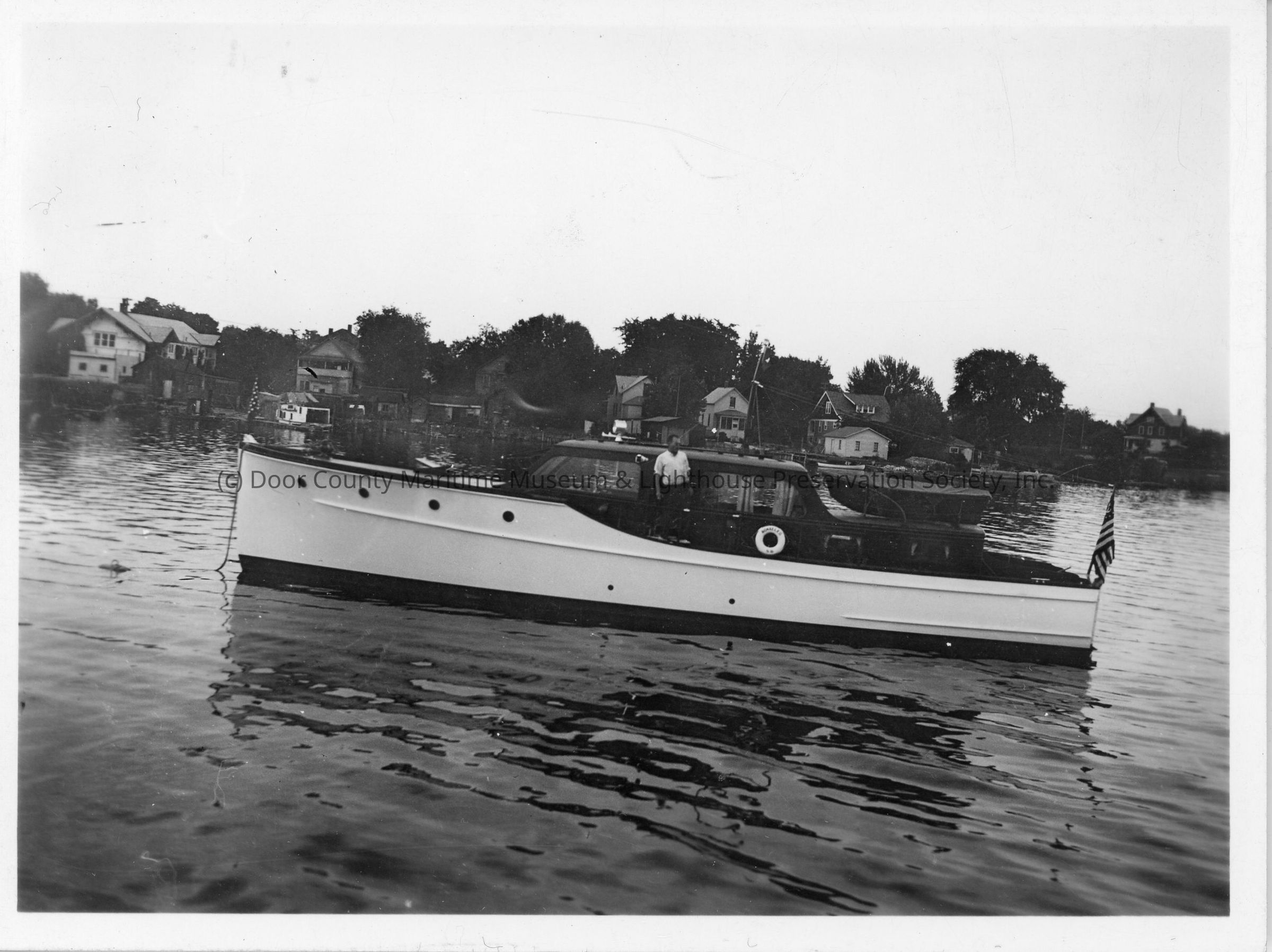 Port side view of man standing on Ronaele II anchored off shore