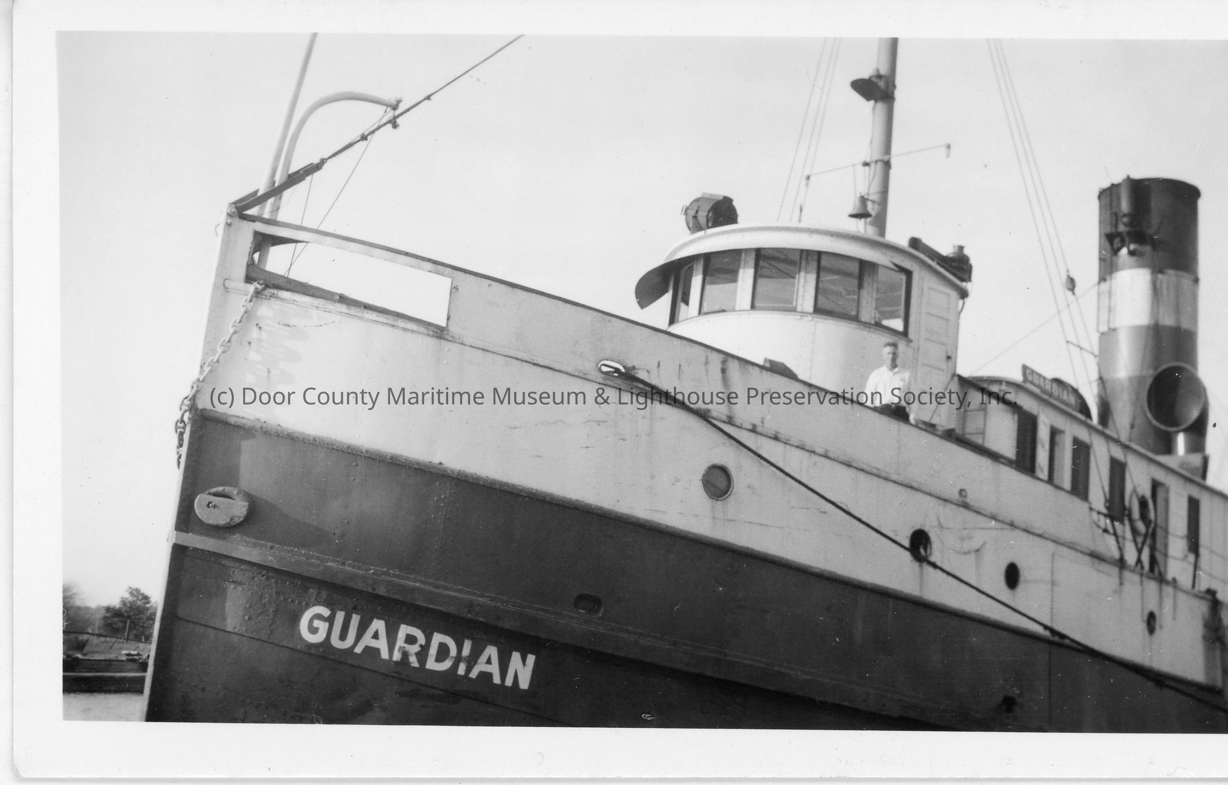Portside bow view of man standing on Guardian