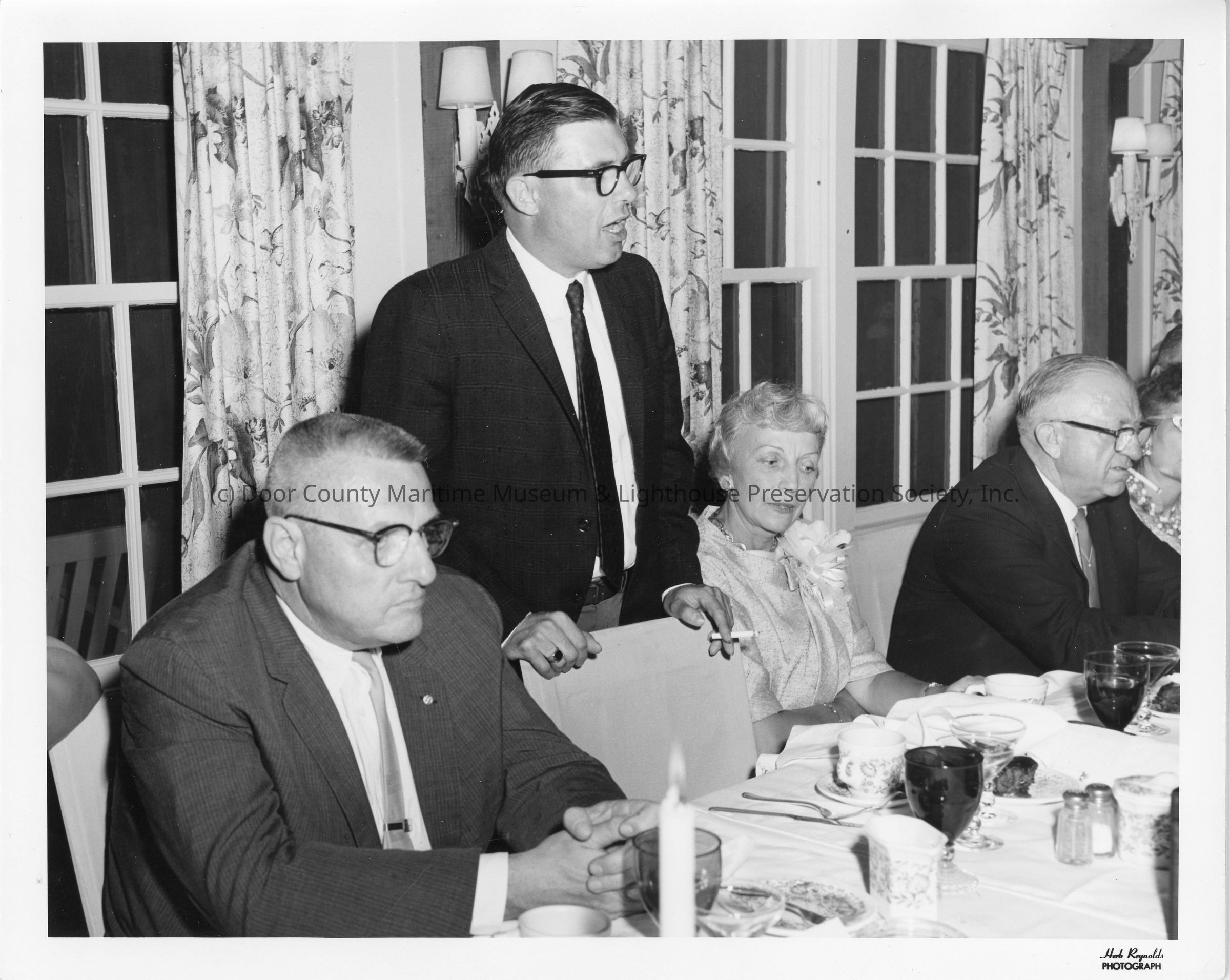 Colorless photograph depciting post launch party of "James M. Gilliss" launched at Christy Corporation. People present include reverend Vernon I. Graf, Roland Christianson, Muriel Humphrey (sponsor), and C. Ray Christianson. The ship launched on May 19, 1962.Location
