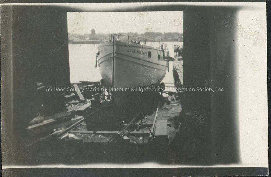 Powerboat Oweenee, Hotz family boat, on rails at Sturgeon Bay boatyard.