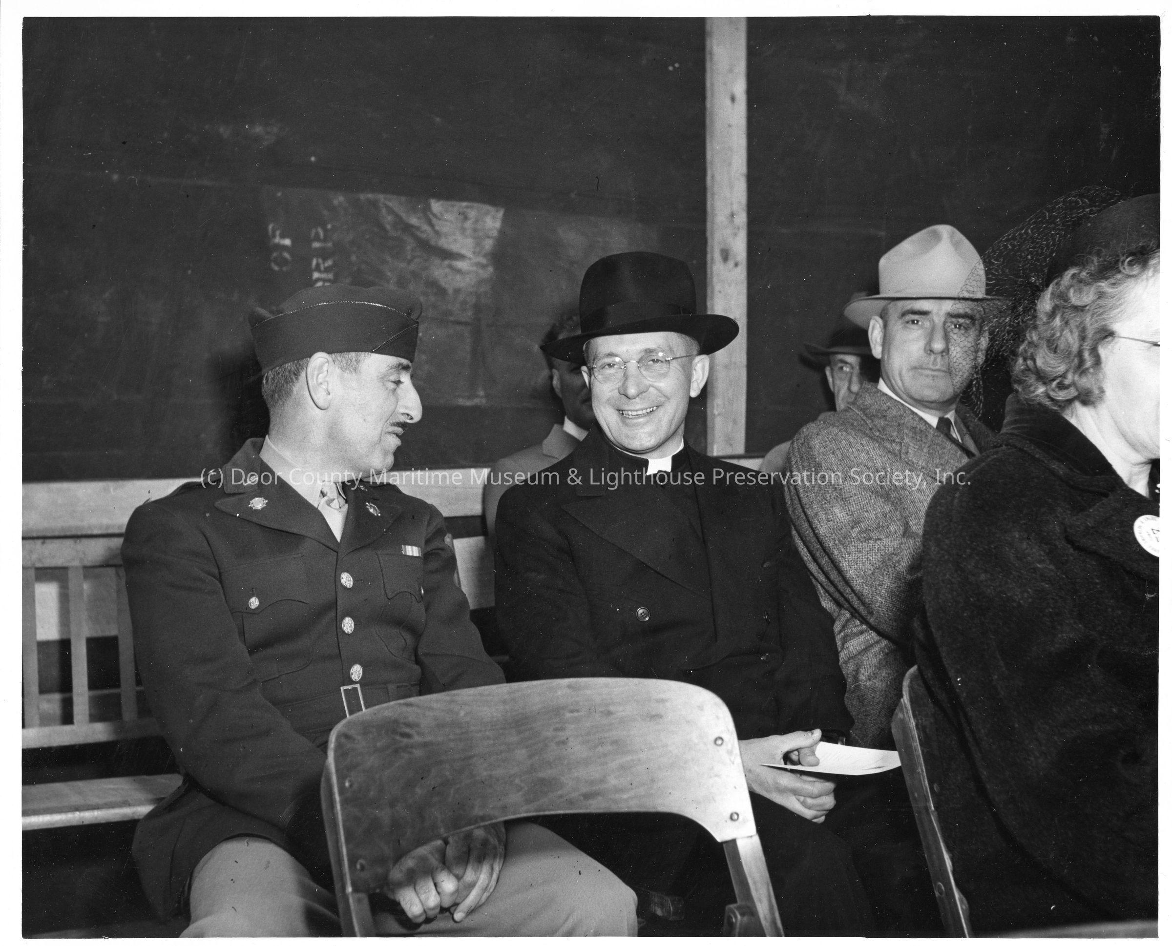 Priest and soldier sitting at ship christening at Peterson Boat Works