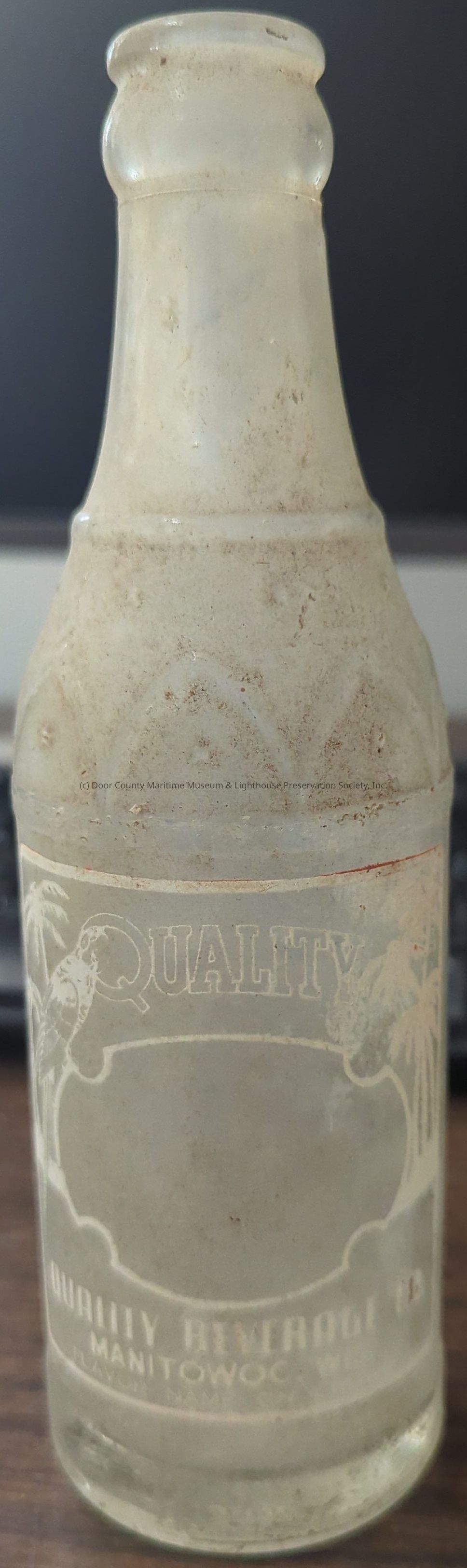 Glass bottle with etched drawing of palm trees and a parrot. Glass is dirty. "Quality Beverage Co. Manitowoc, Wis. Flavor name on crownLocation