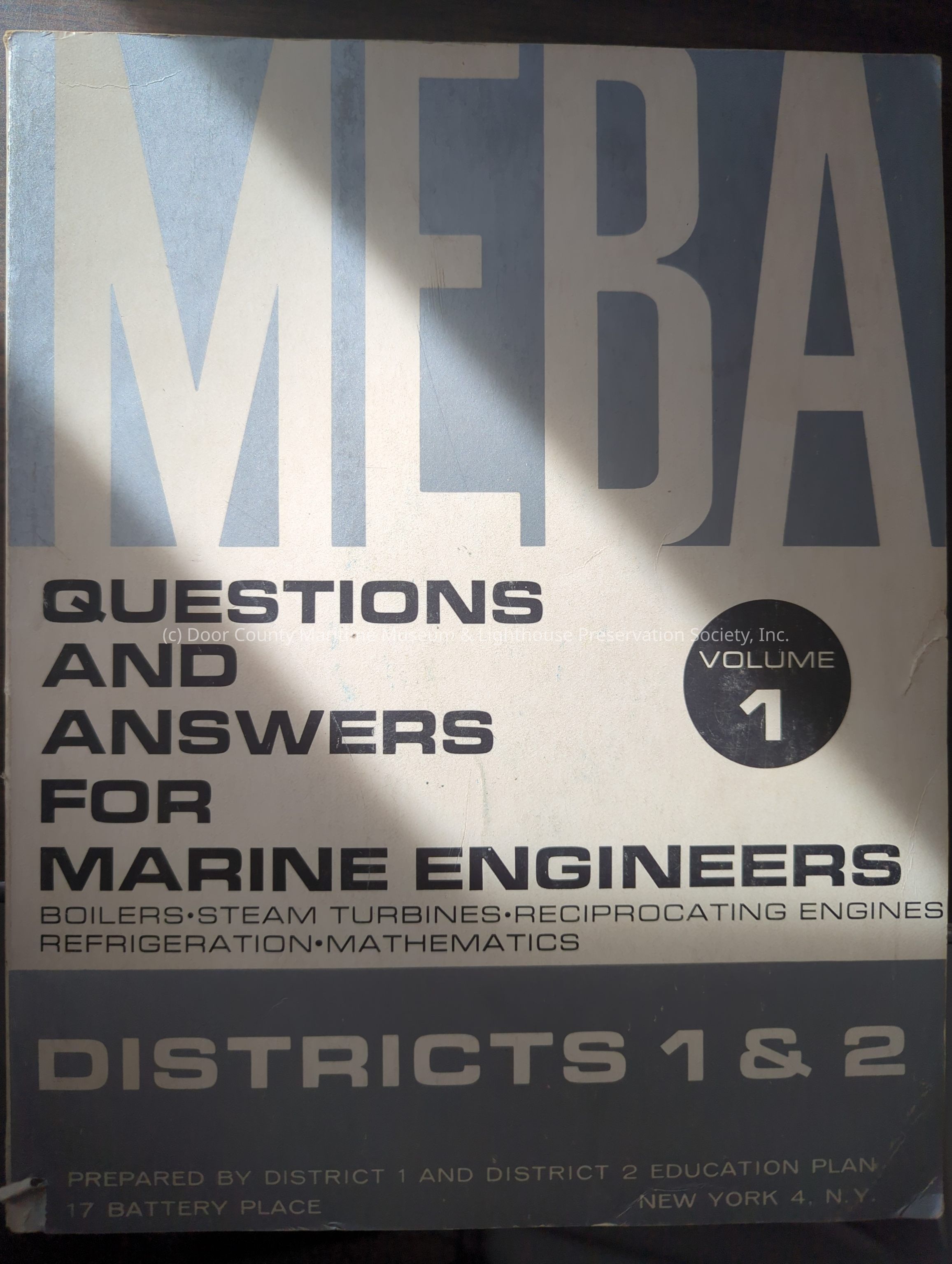 Silver, white, and black soft cover course book. "Questions and Answers for Marine Engineers Volume 1. Boilers, steam turbines, reciprocating engines, refrigeration, mathematics"Location