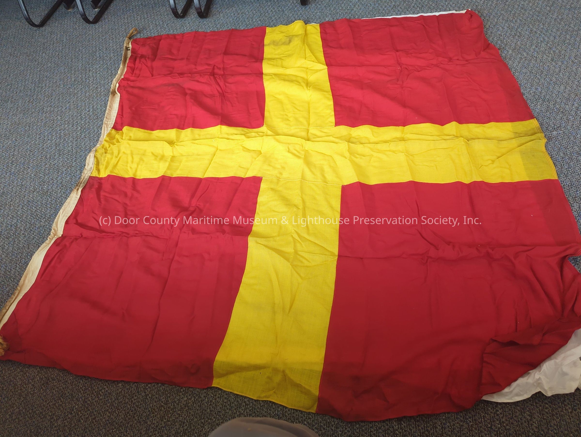 Signal flag: "R"; square; red squares in each corner; yellow "cross" in middle; dirty.