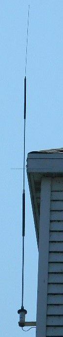 "Shakespeare" radar antenna for Loran C; style S202 UHF; 4" dia. round gray metal base with four mounting holes; silver metal with white plastic-covered antenna wire; white metal tubular antenna 1" dia. at bottom, narrowing to 1/2" diameter at top; black tip on top.Location