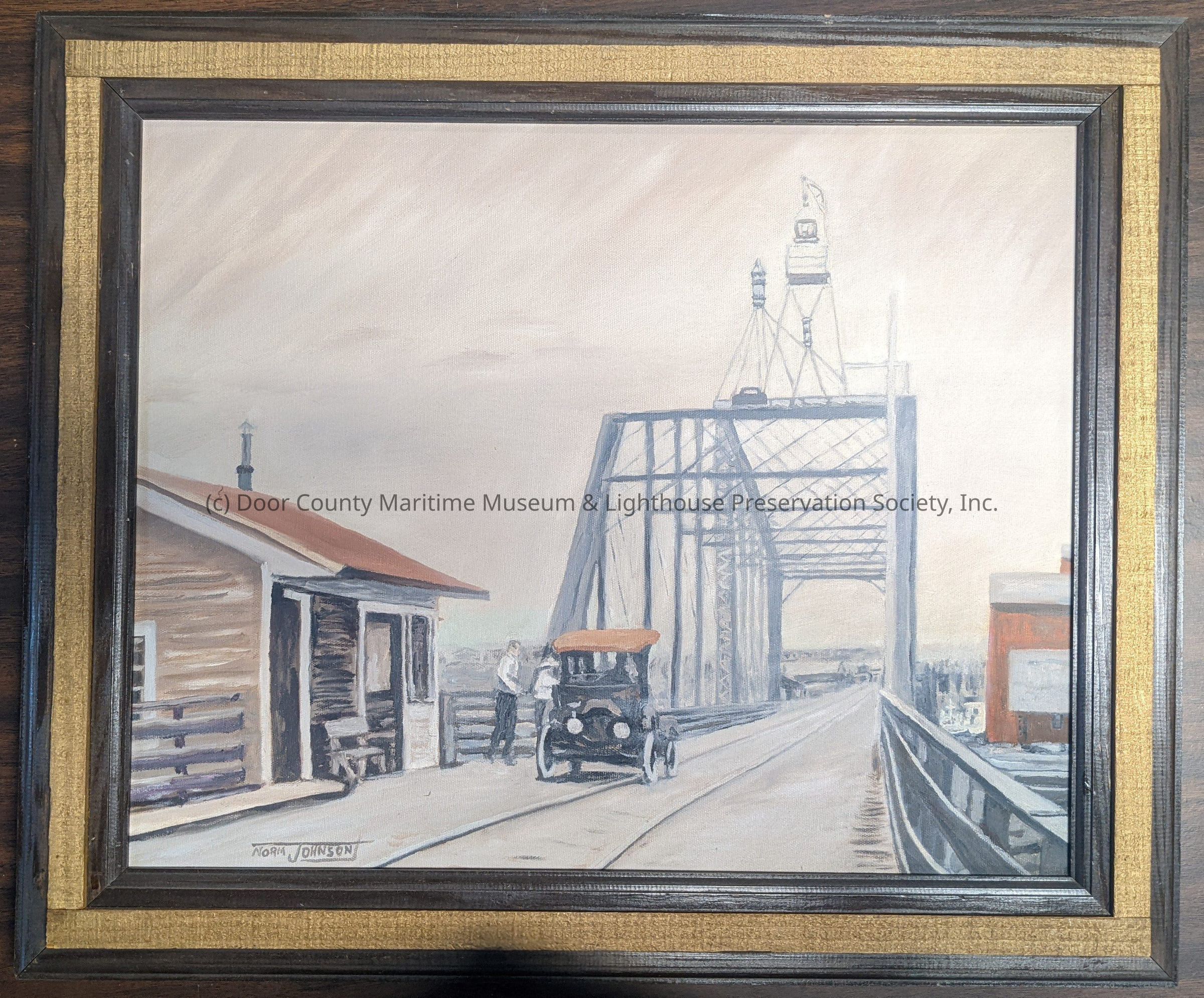 Framed panting depicting car on a railroad bridge.
