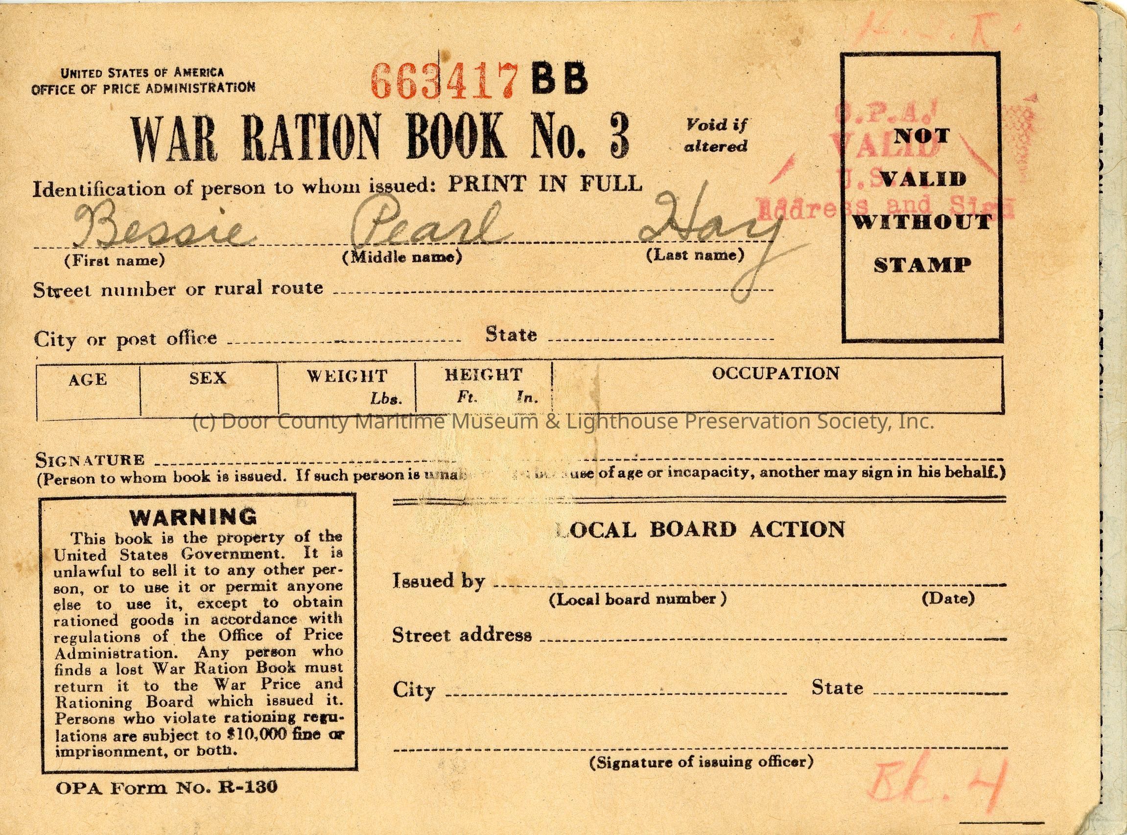 Tan paper; WAR RATION BOOK No. 3; issued to Bessie Pearl Hay; No. 663417BB; includes ration stamps.Location