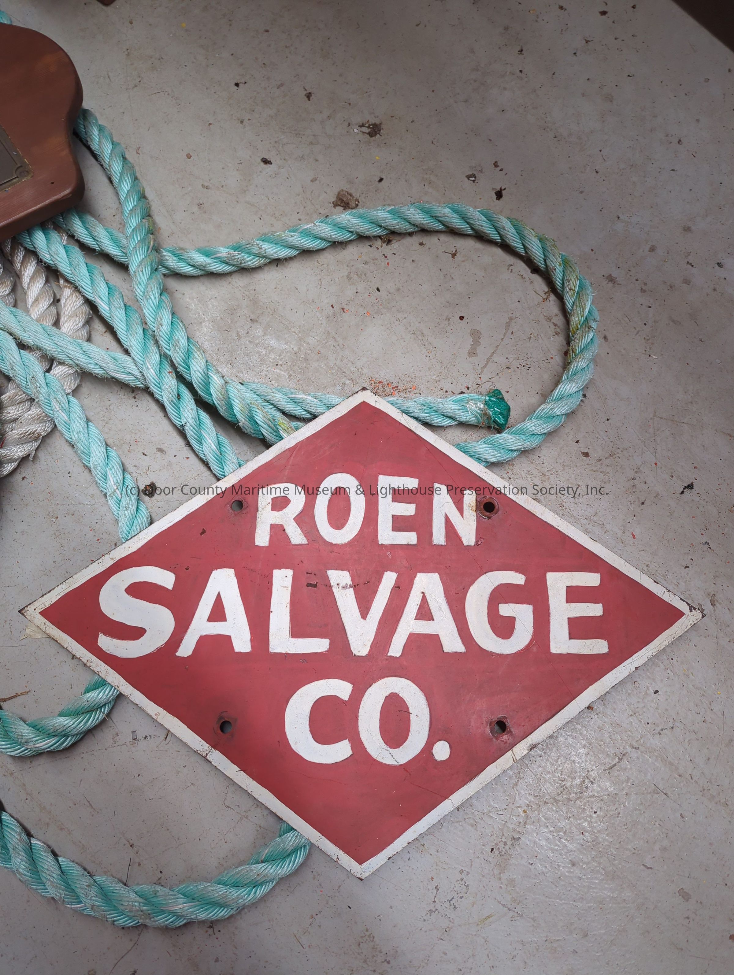 Diamond shape. Red with white boarder and lettering. "Roen Salvage Co." Four holes for mounting