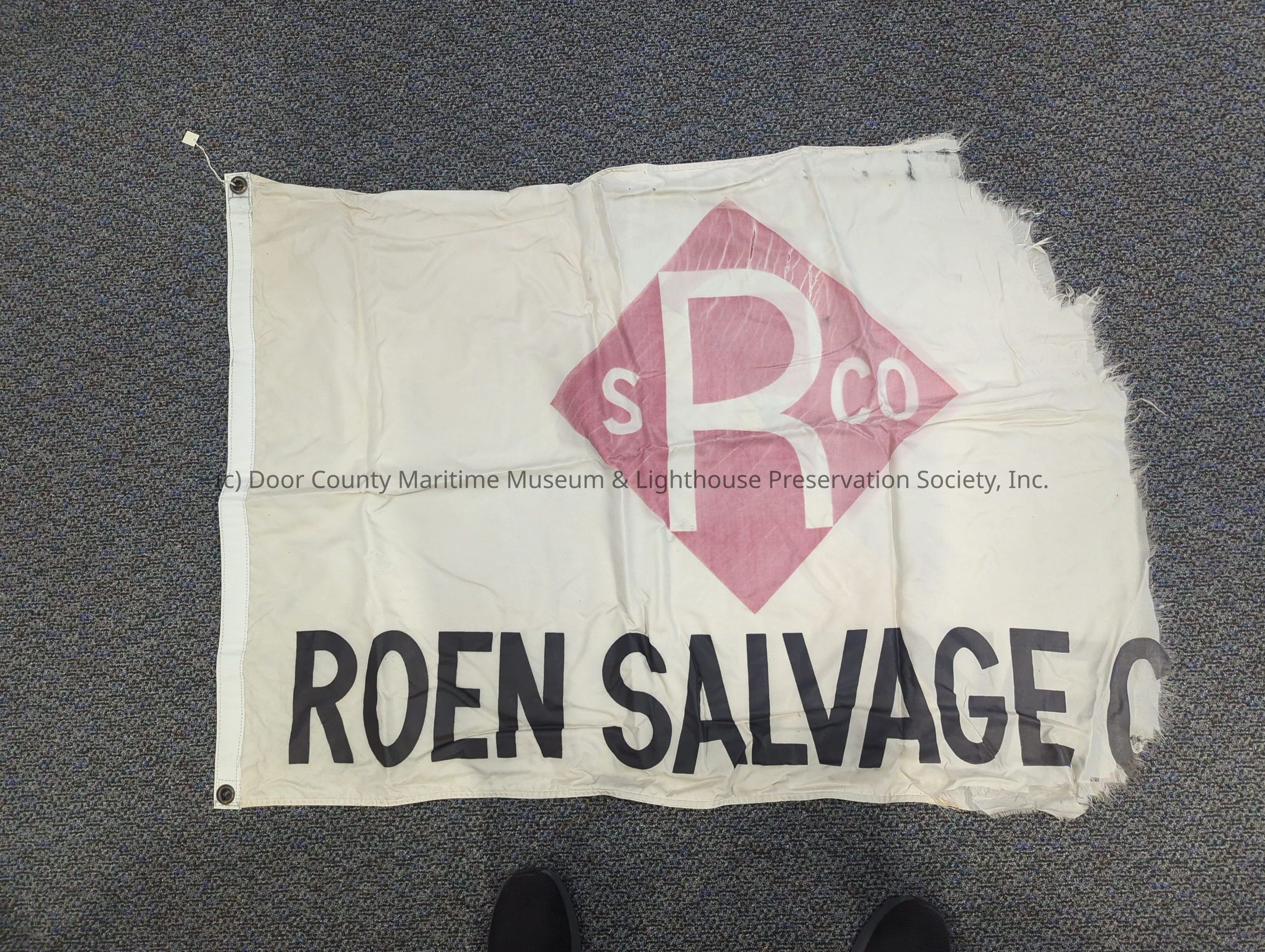 Tattered white and red flag. Roen Salve Company logo on the frontLocation
