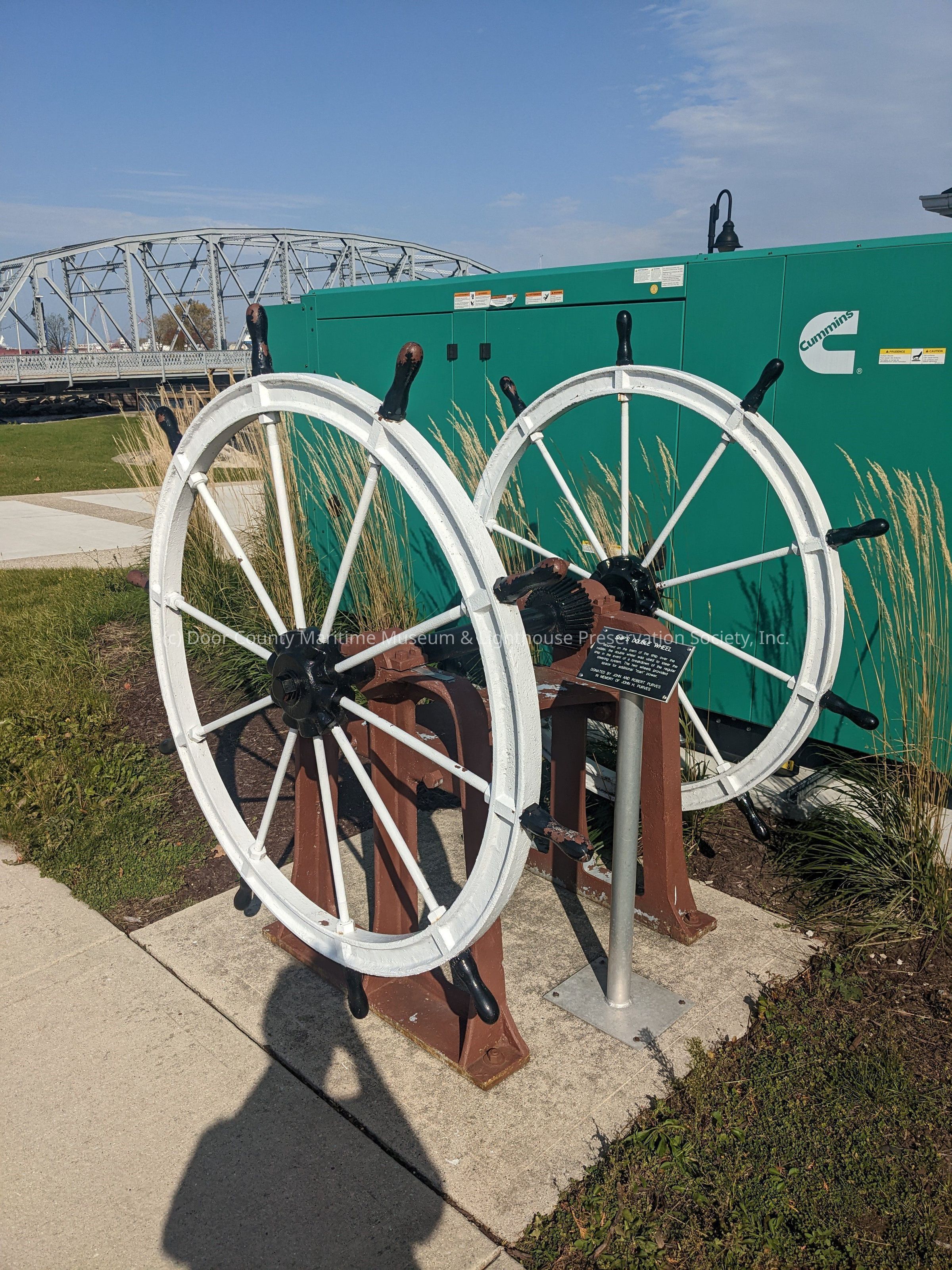 Double ship's wheel; 10 spokes, 66" diameter from spoke tip to spoke tip, on iron mount; wheel is white; support stand is gray, bolted to concrete; handle part of spokes is black; black shaft and gear.Location