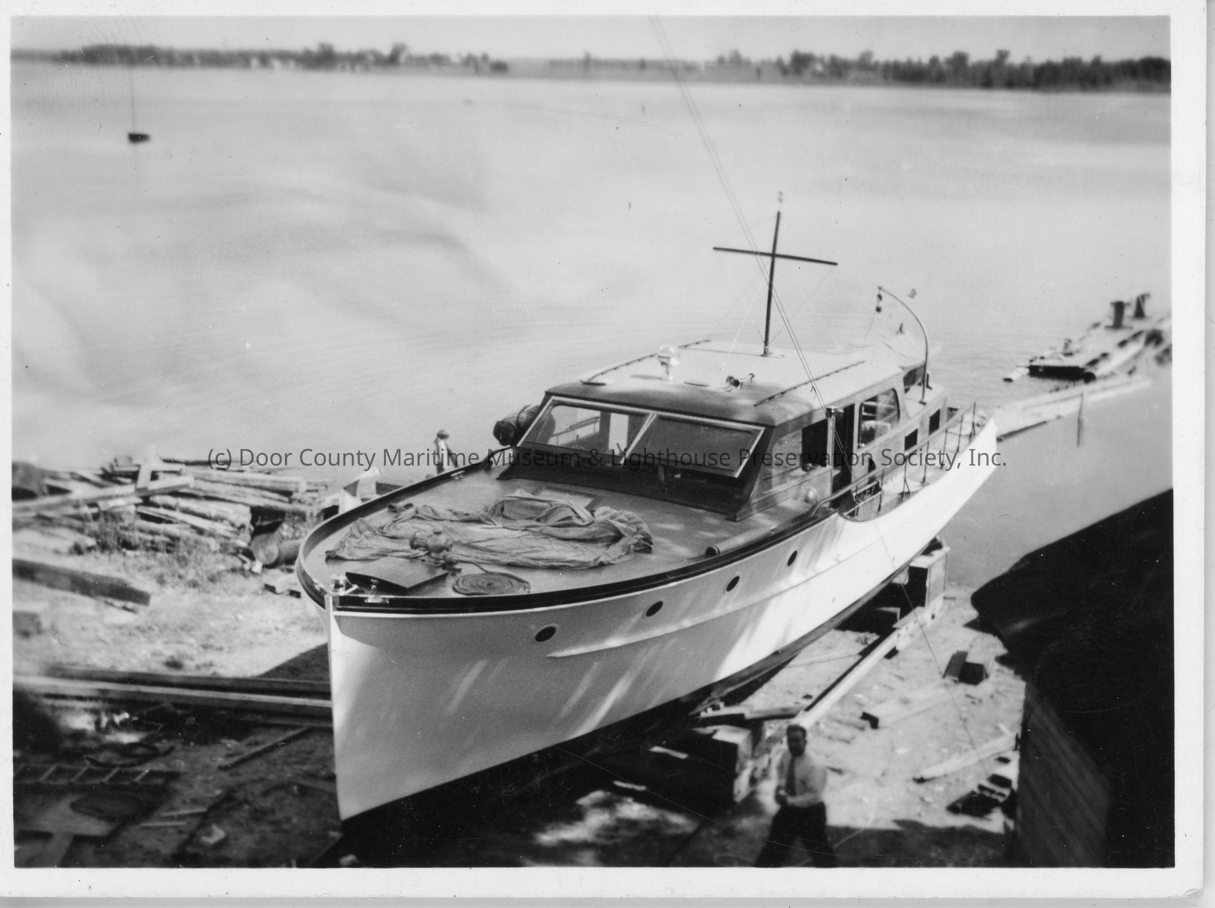 Ronaele II on cribbing pre-launch at Peterson Boat Works