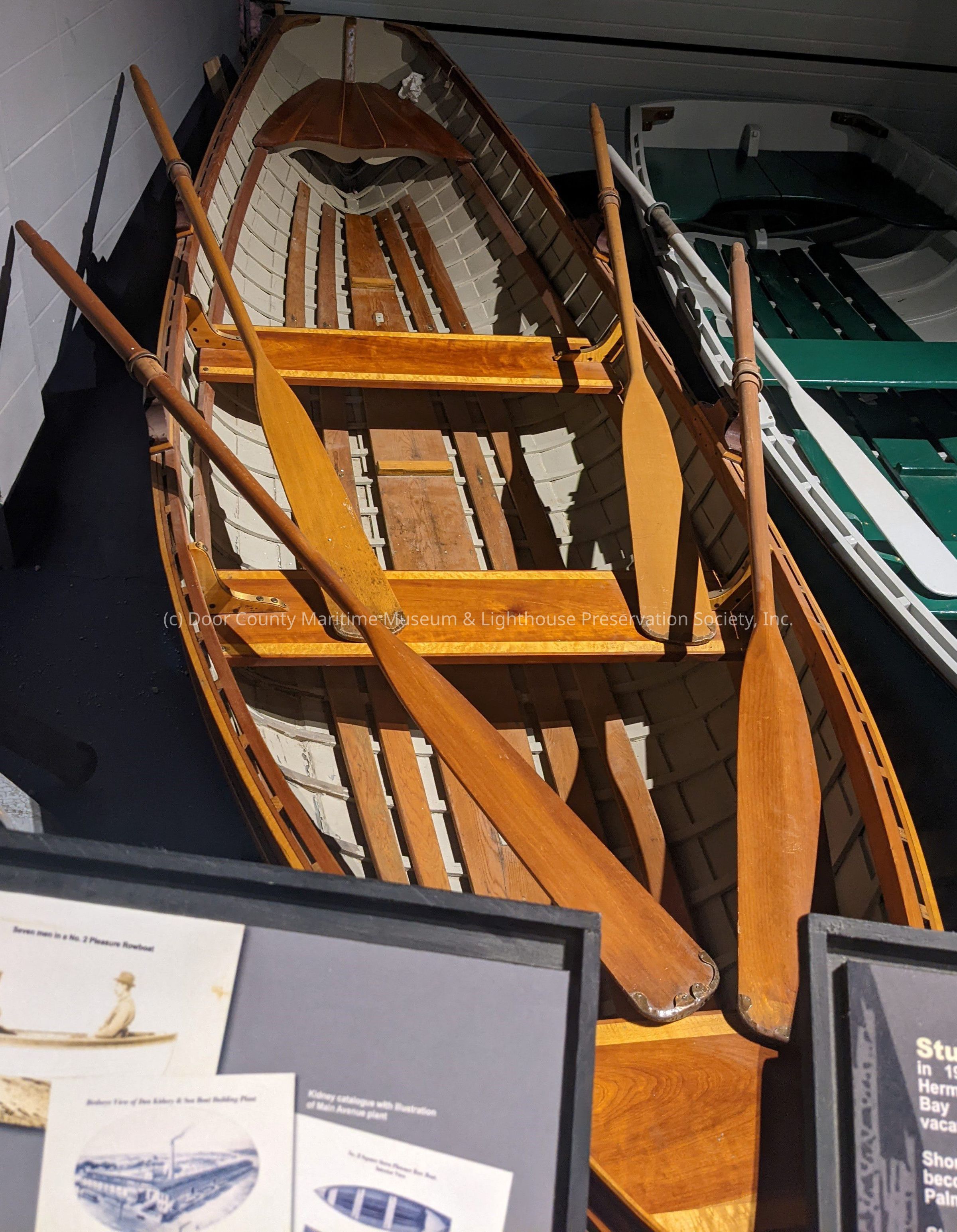 Class B #2 square stern pleasure rowboat; painted navy outside with oak fender rail; inside painted grey; walnut seats trimmed in maple; 4 oars=2 light & 2 dark wood; wood slats on floor board; 4 oar locks--polished brass.Location