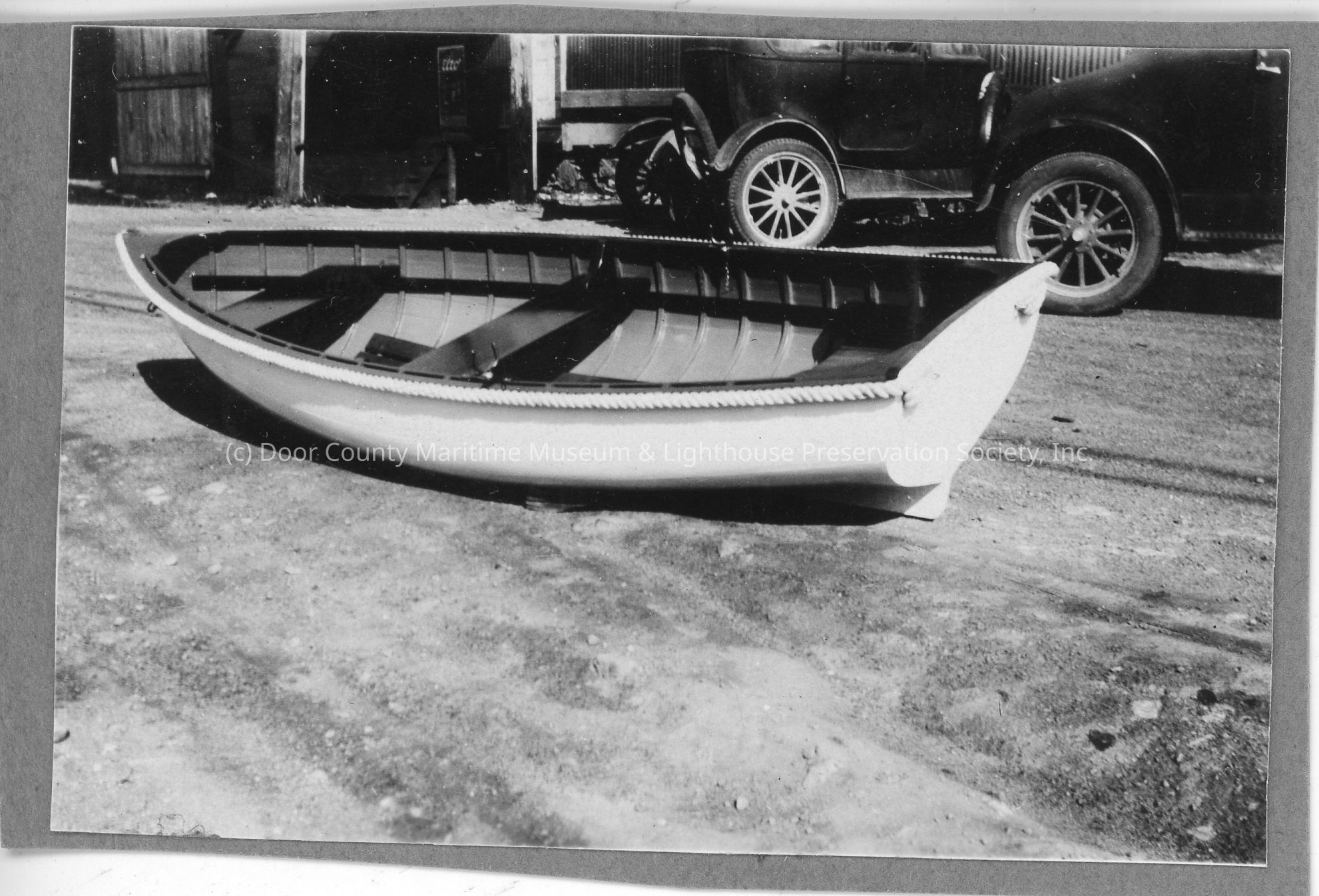 Rowboat on ground with cars in background