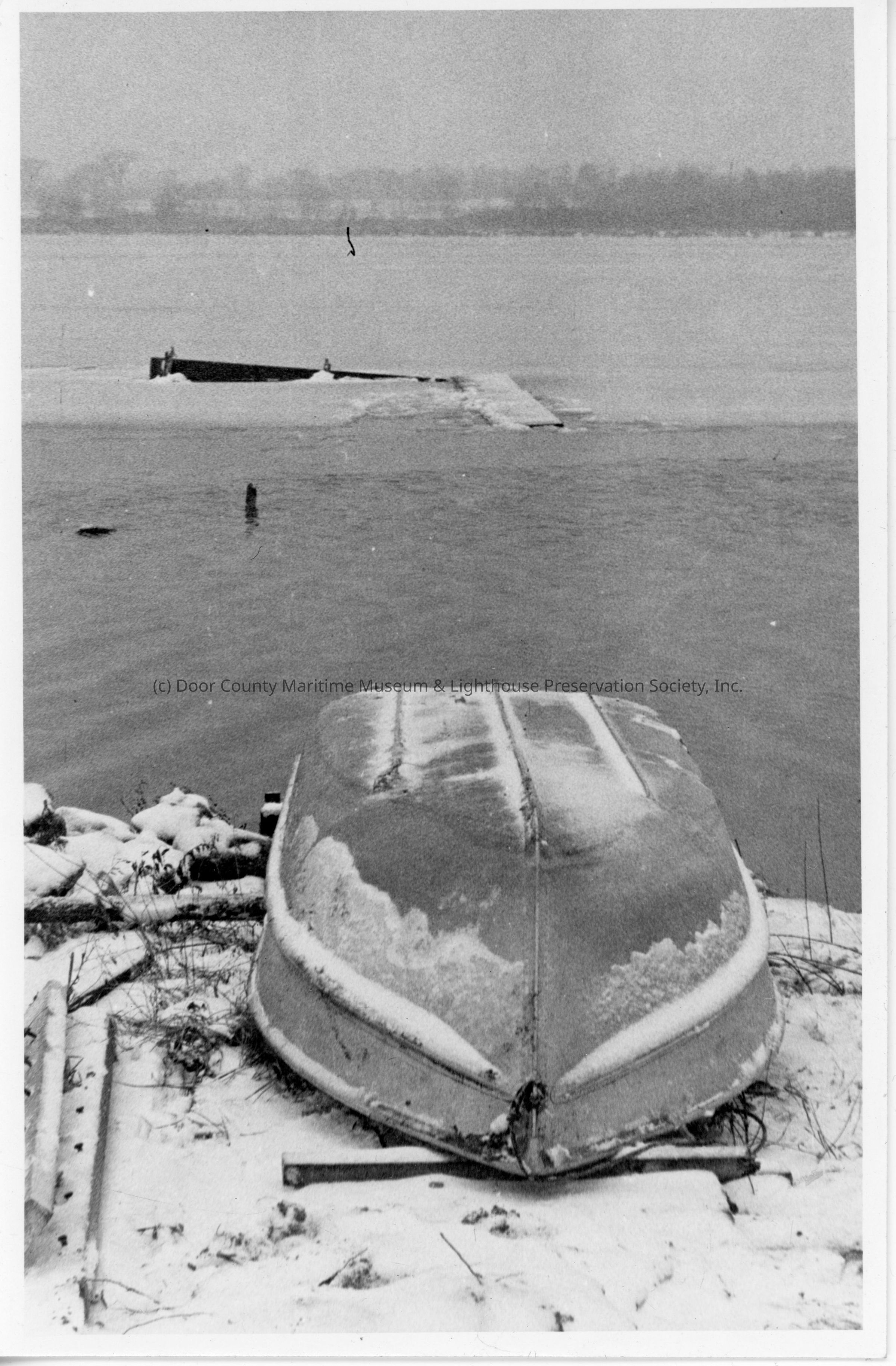 Rowboat on shore with dock sinking in background 1959